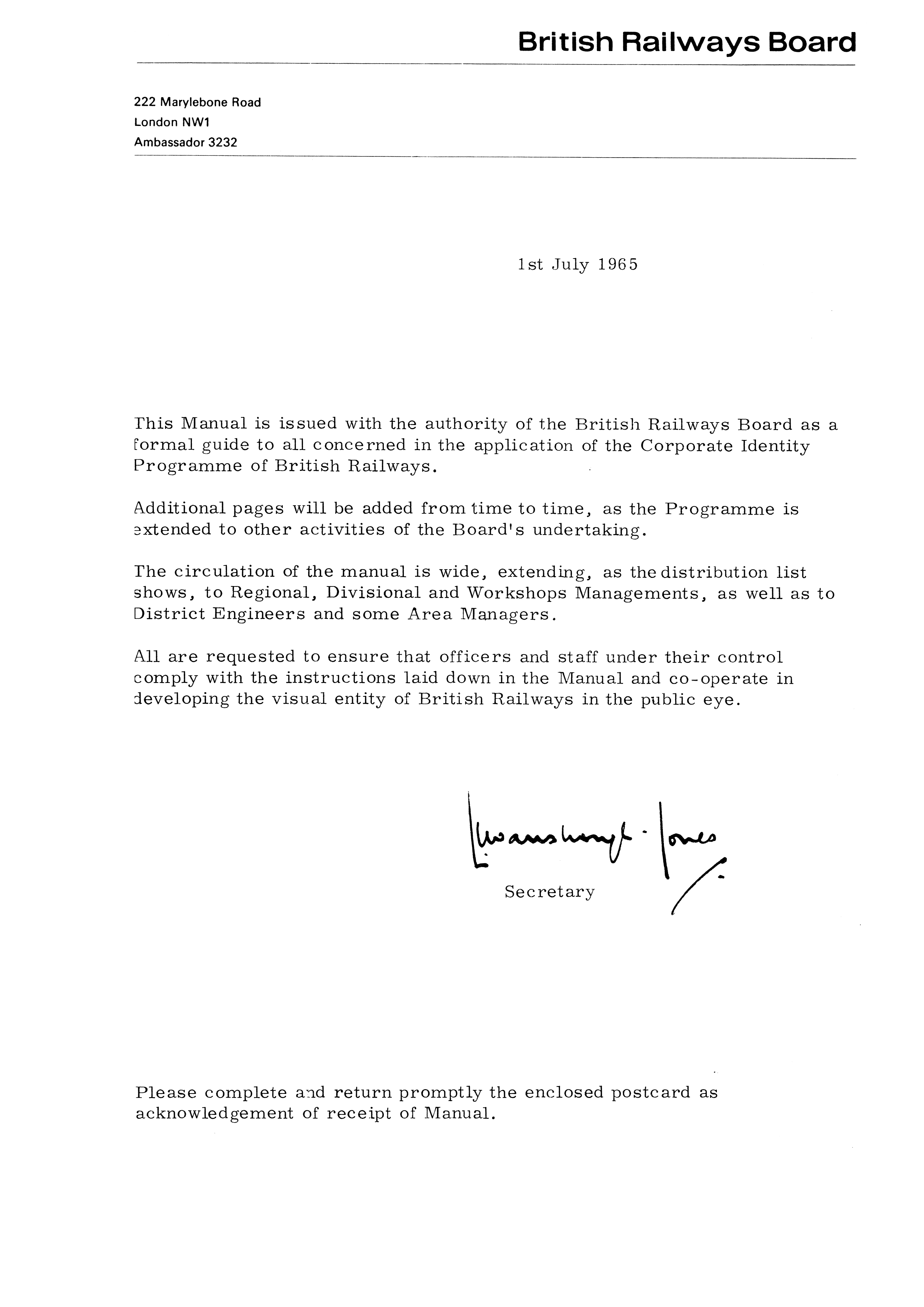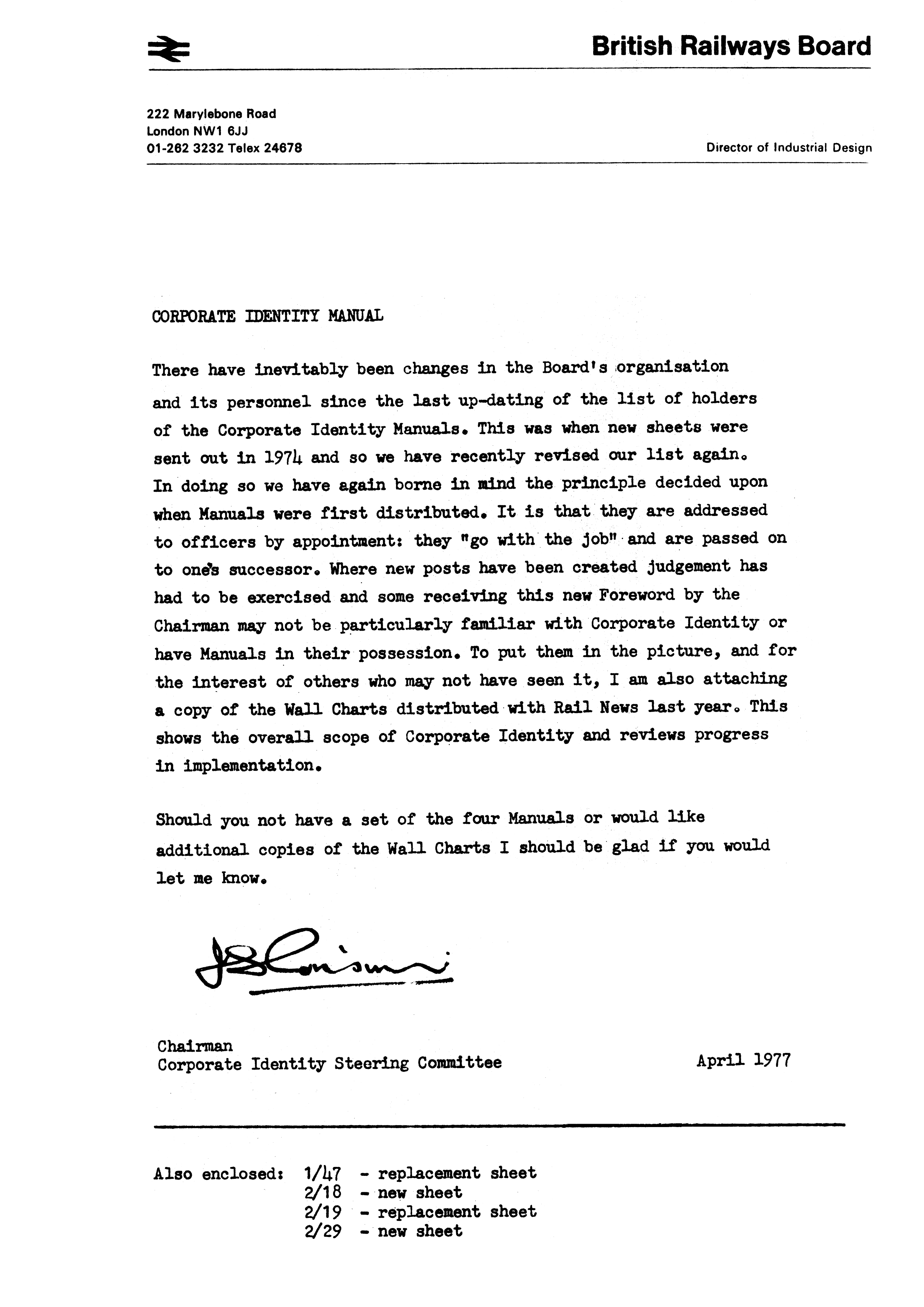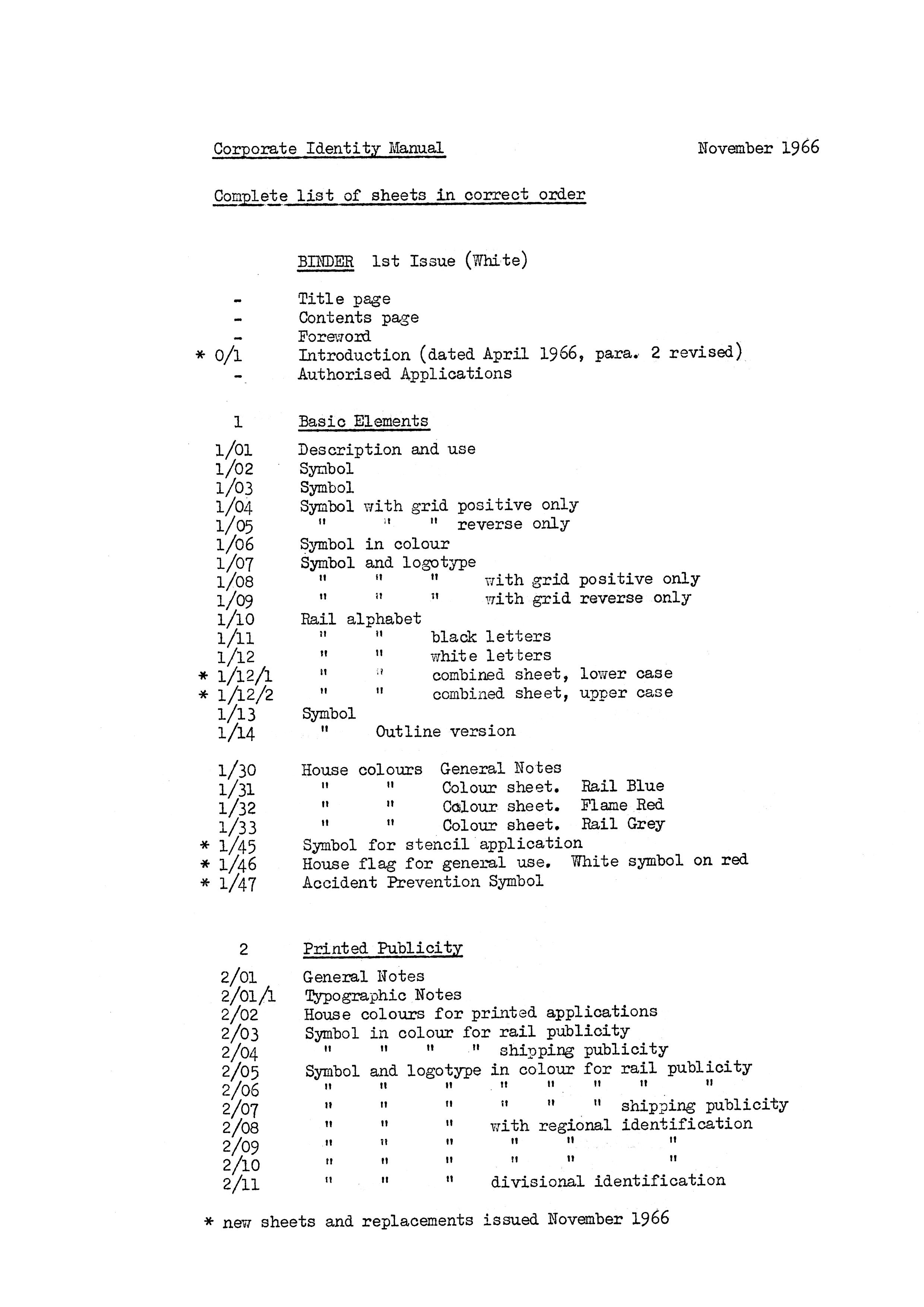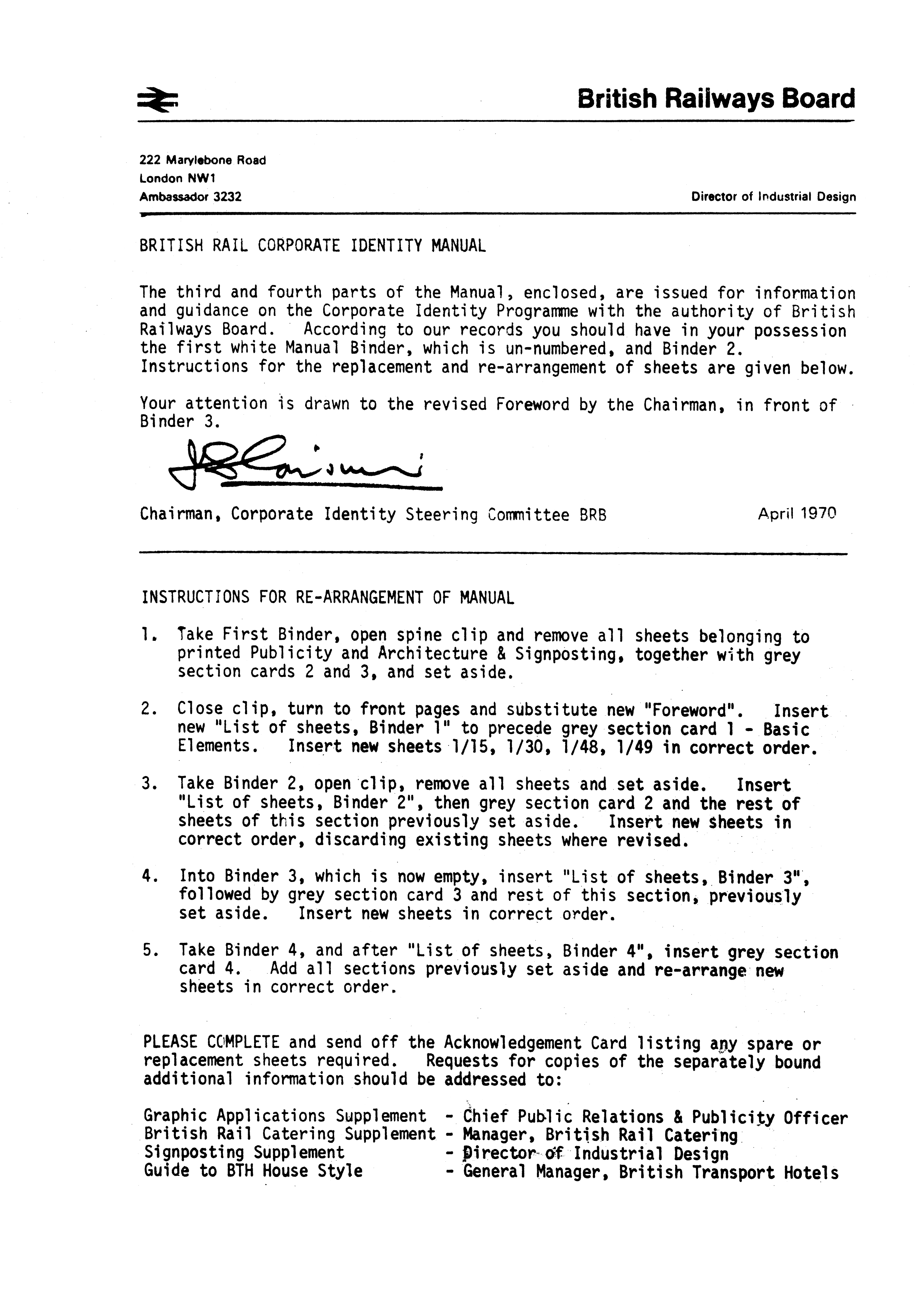 AddendaCorrespondenceThis section contains items of correspondence shipped with the various Corporate Identity Manuals as they were published, giving details of how the manual should be assembled, and which pages should be discarded etc. Publication of Binder 1 (July 1965)