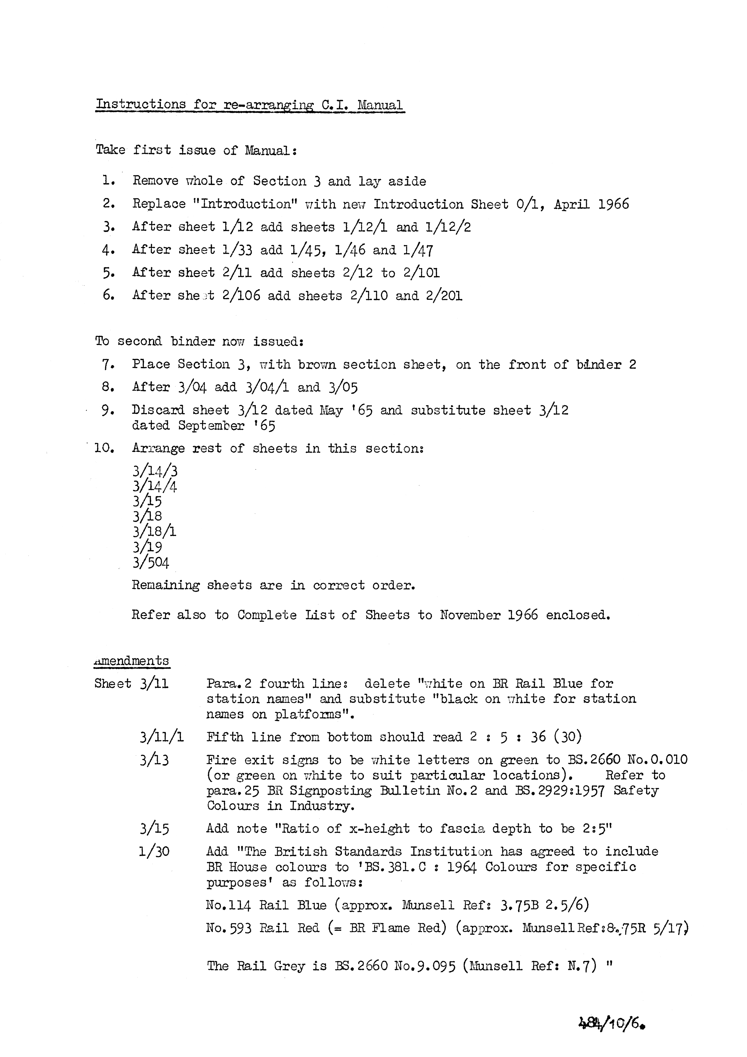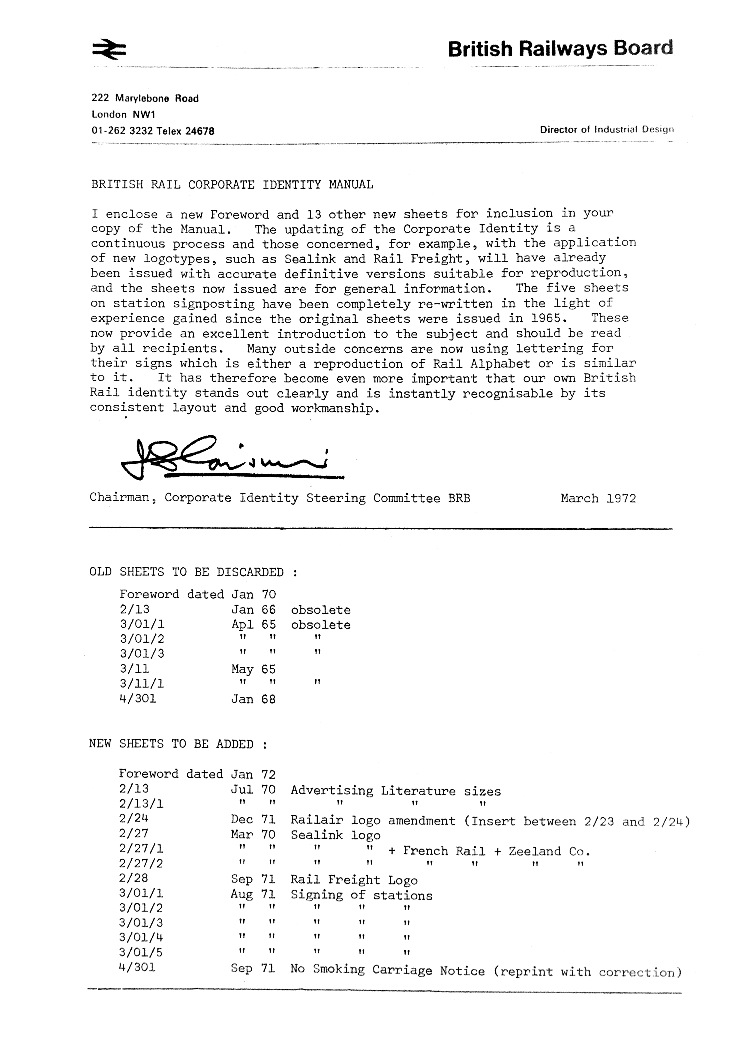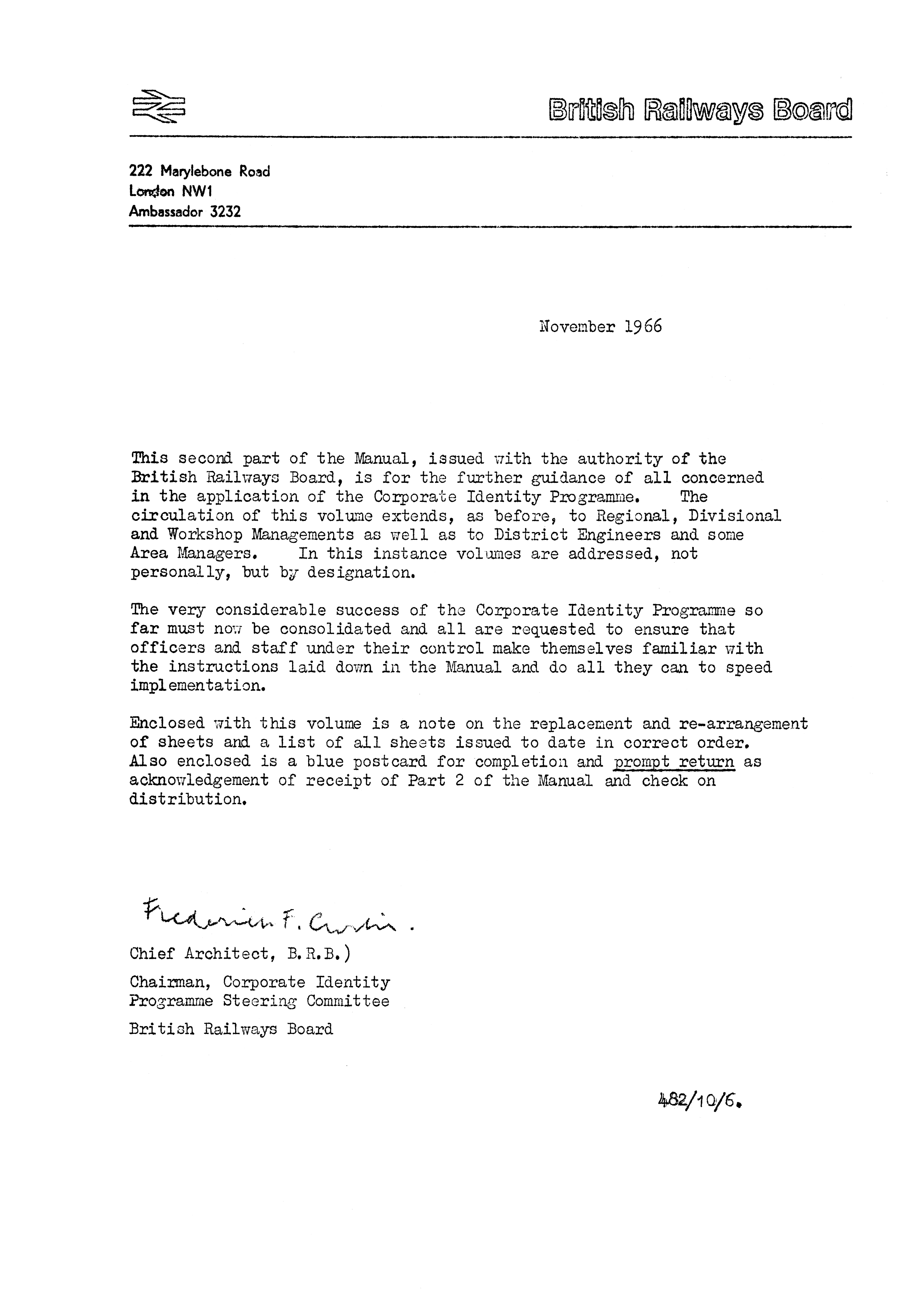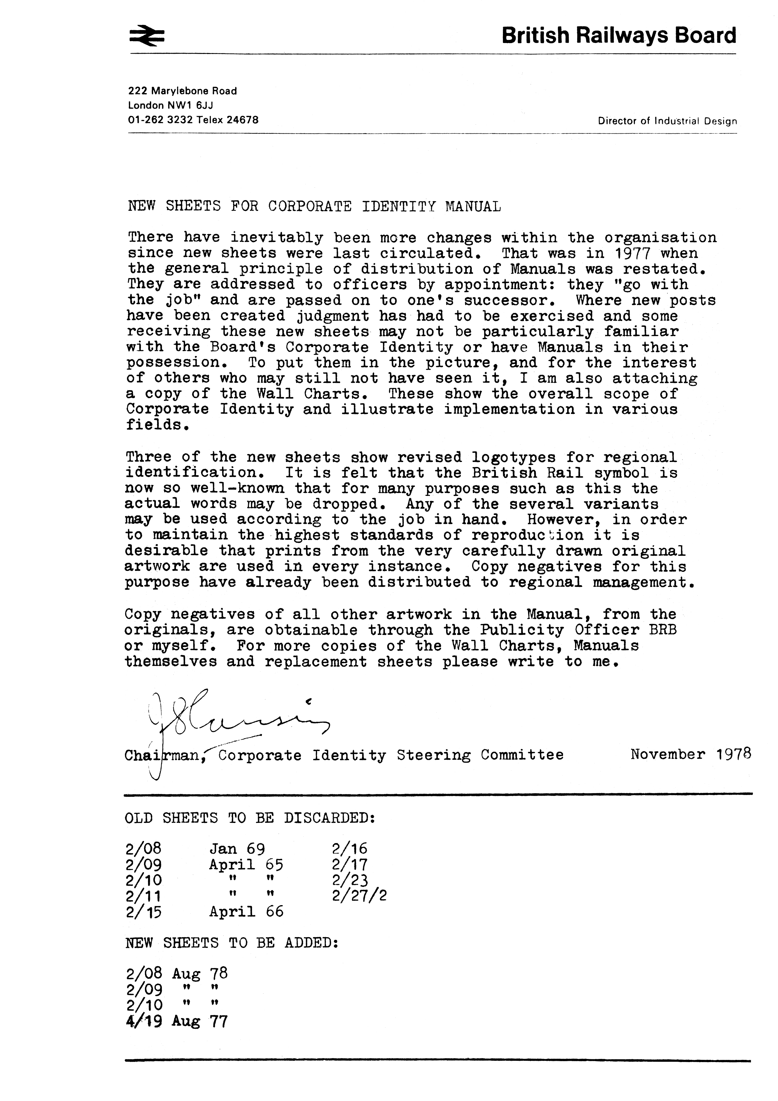 AddendaCorrespondenceThis section contains items of correspondence shipped with the various Corporate Identity Manuals as they were published, giving details of how the manual should be assembled, and which pages should be discarded etc. Publication of Binder 1 (July 1965)