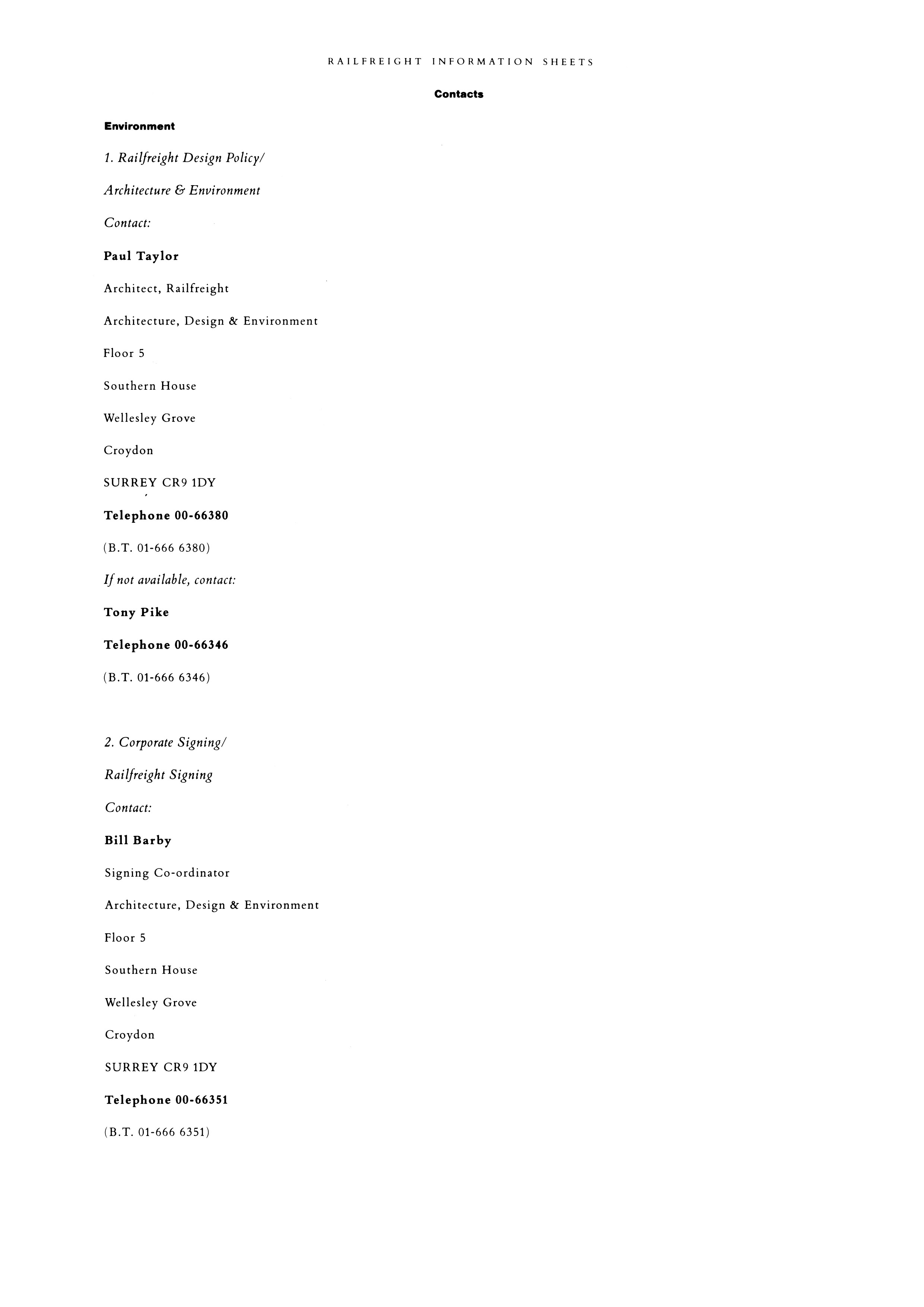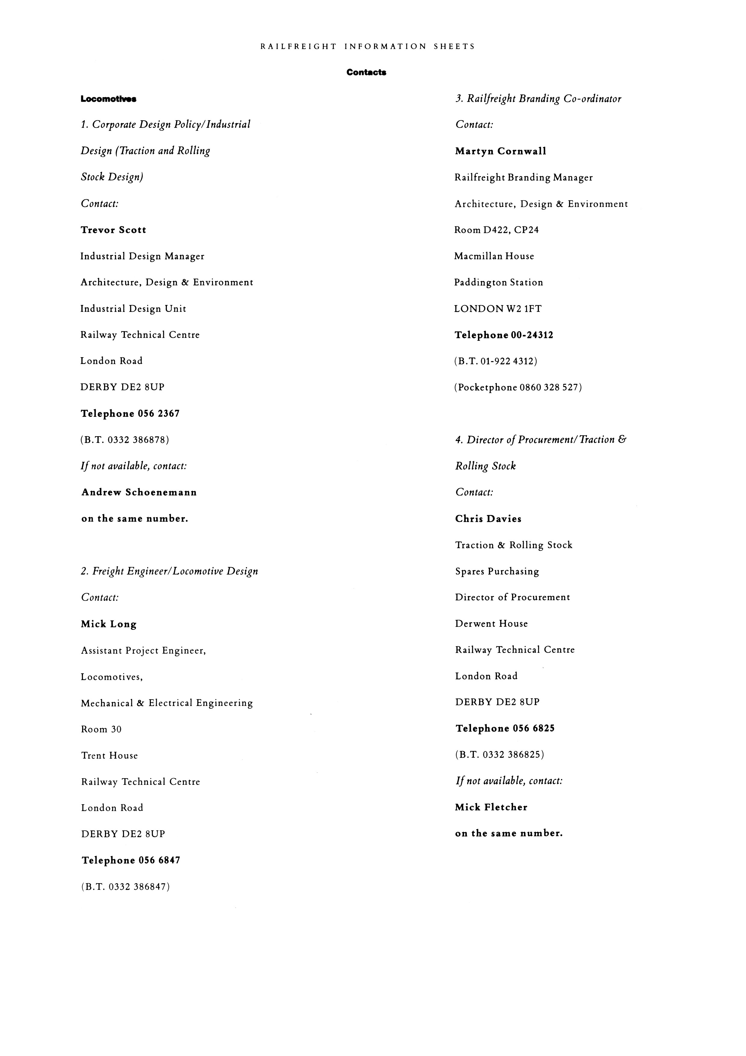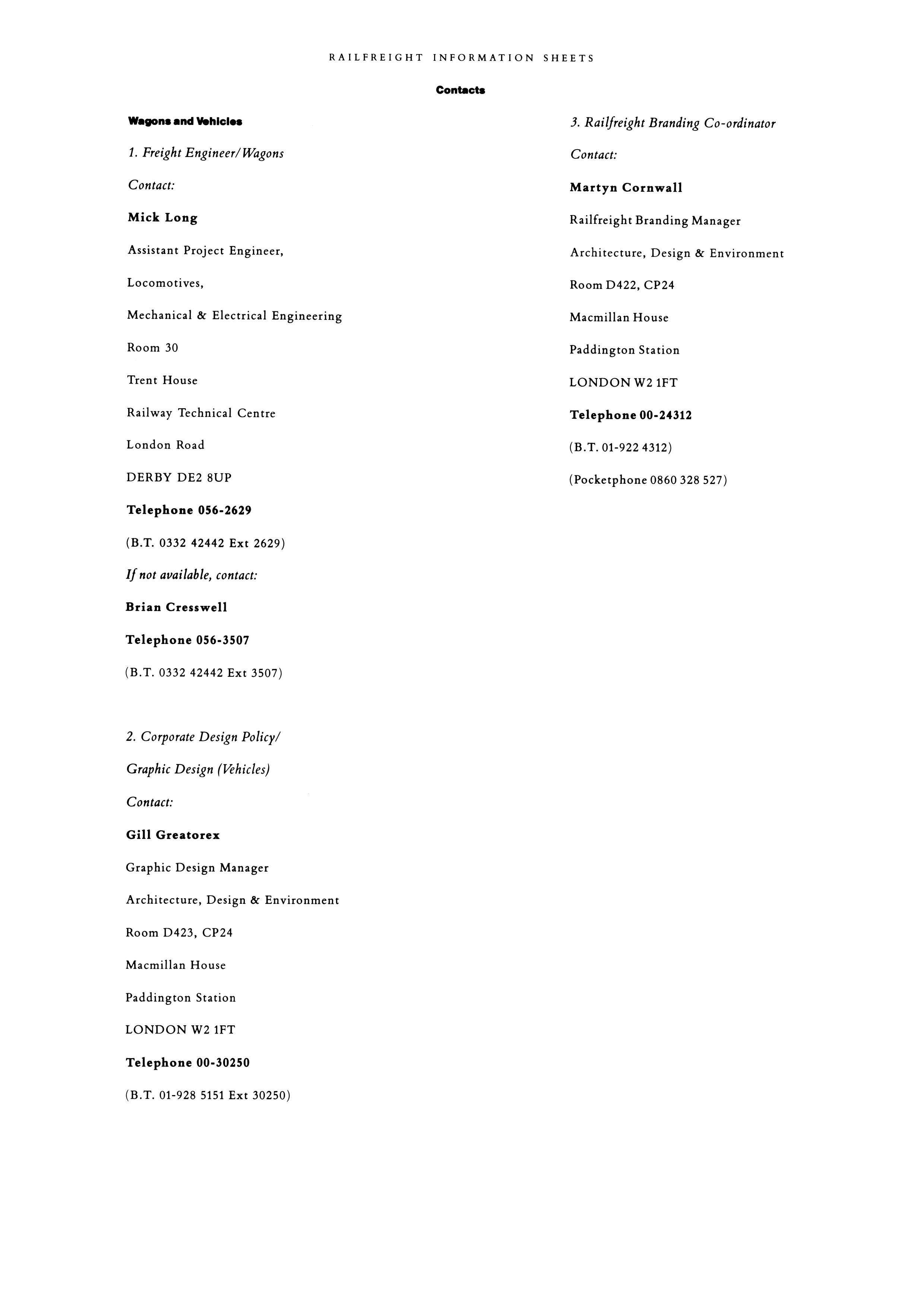 In November 1988, the new Railfreight information sheets from the British Rail range were included in a four-ring binder for ease of distribution. The binder also contained section dividers and some additional pages included in the section below. For the Railfreight information sheets themselves, please see the British Rail range of information sheets.