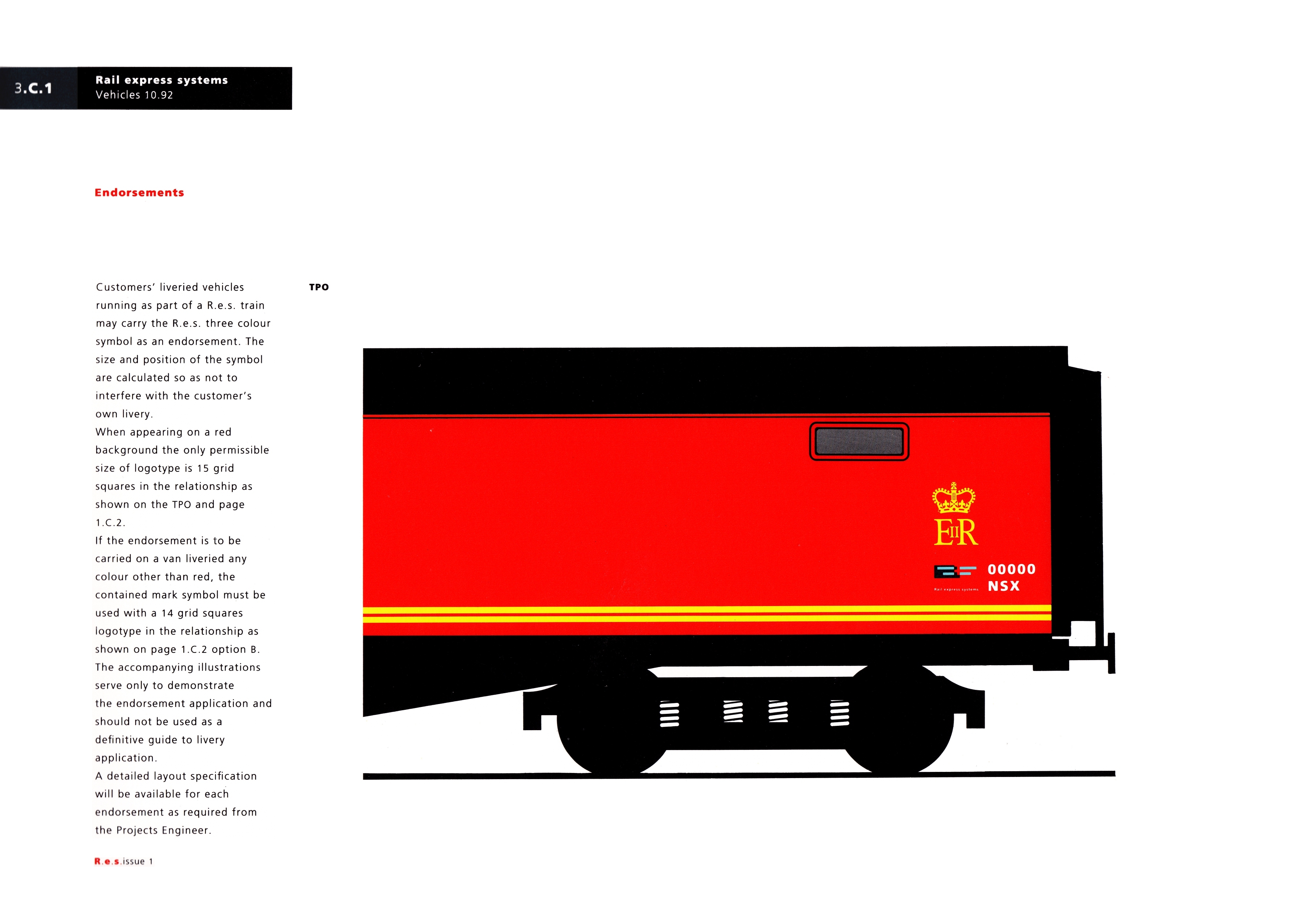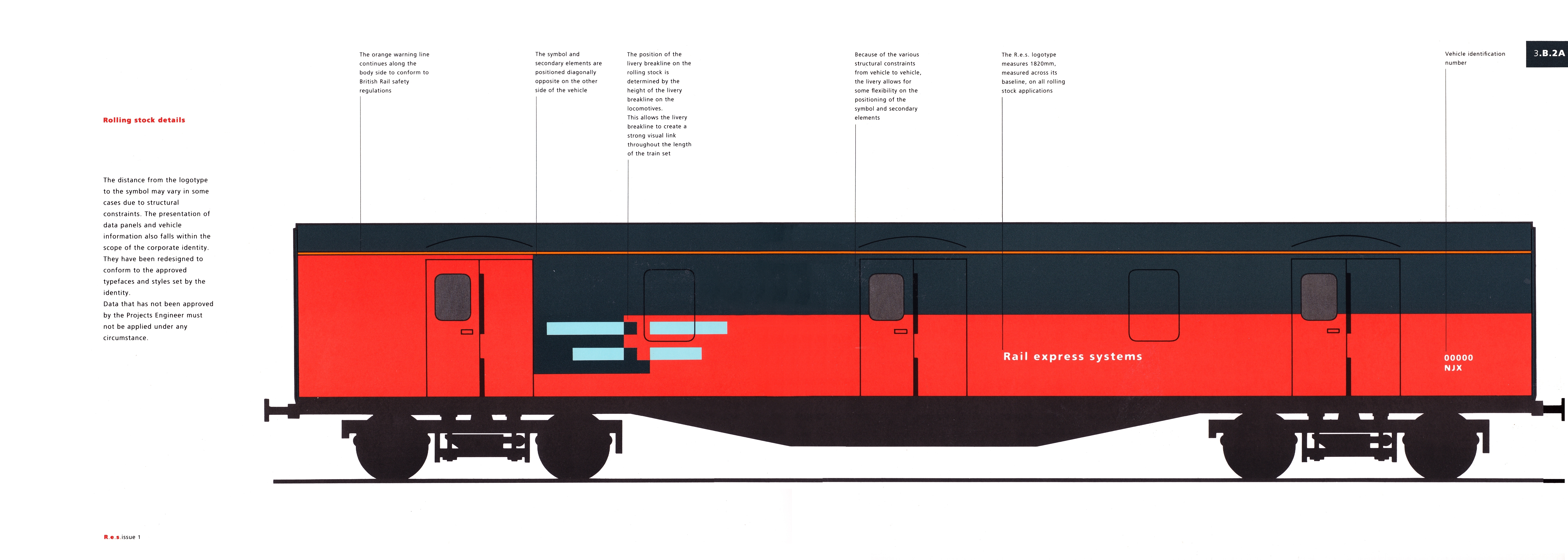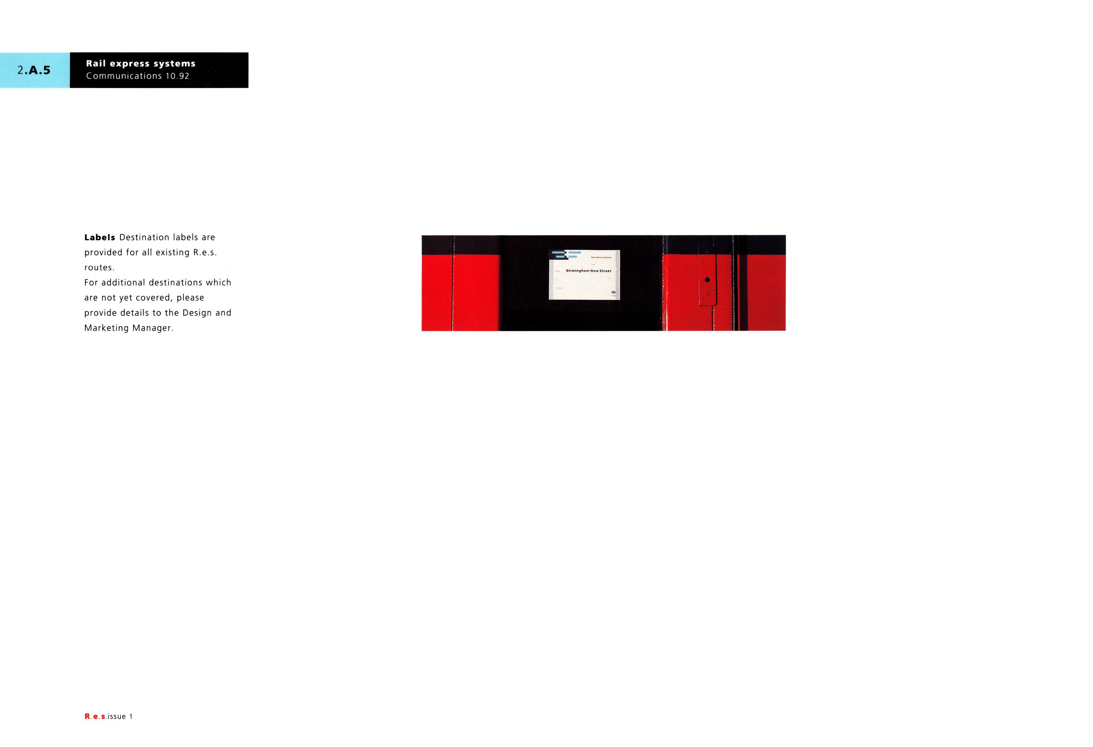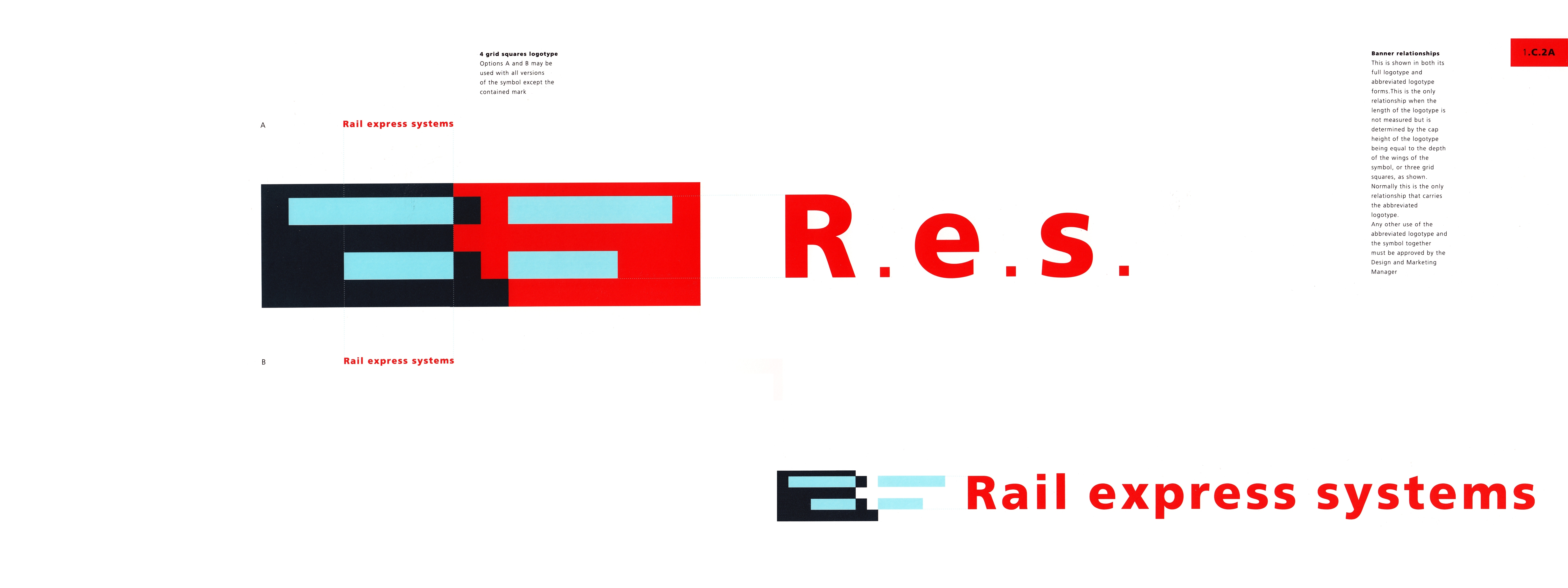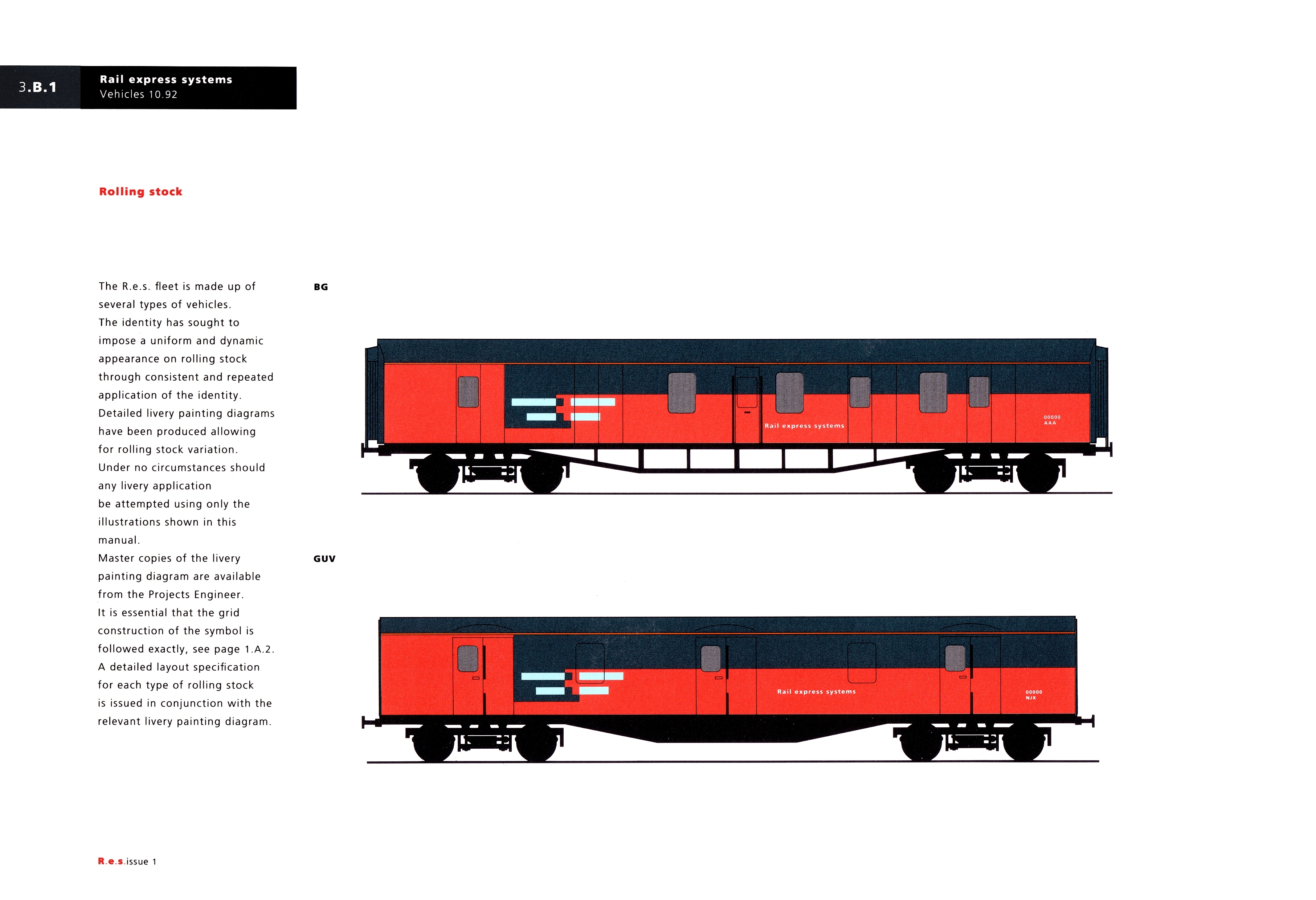 The British Rail Parcels sector—responsible for the distribution by rail of parcels and mail—was rebranded Rail express systems (R.e.s.) in 1991. The design work was once again awarded to Roundel Design following the successful rebranding of Railfreight in 1987. In October 1992 R.e.s. released a Design Manual in landscape 4-ring binder format with 307×210mm pages on 250gsm stock, many of which were double-sided and some folded out.
