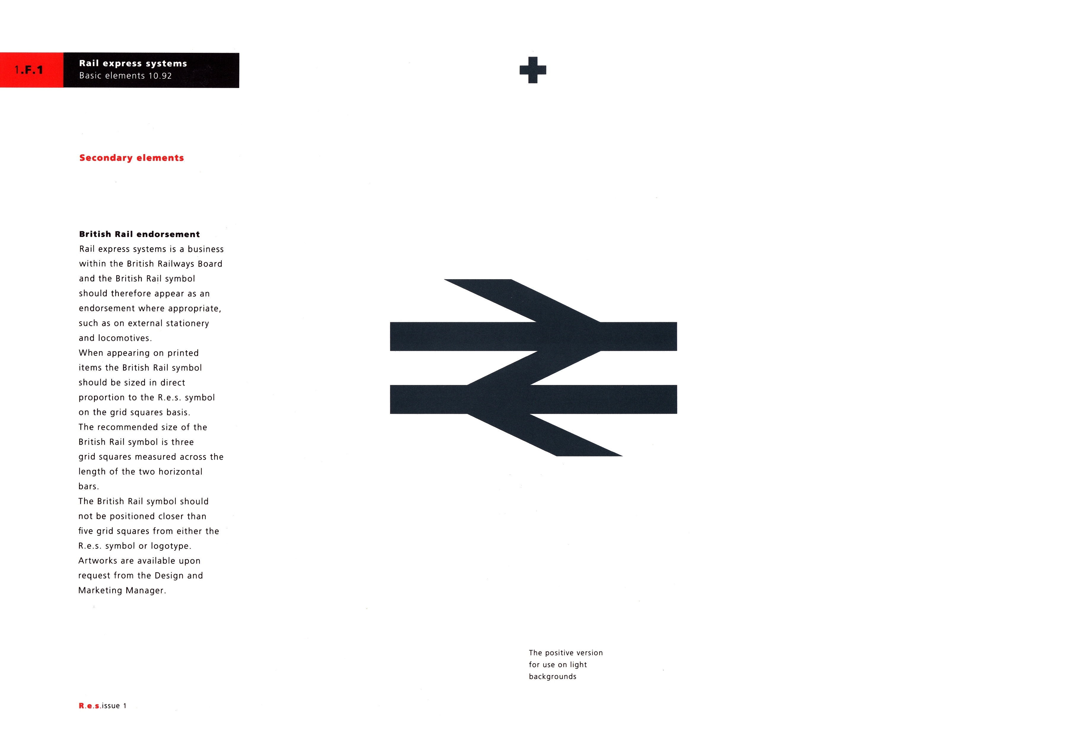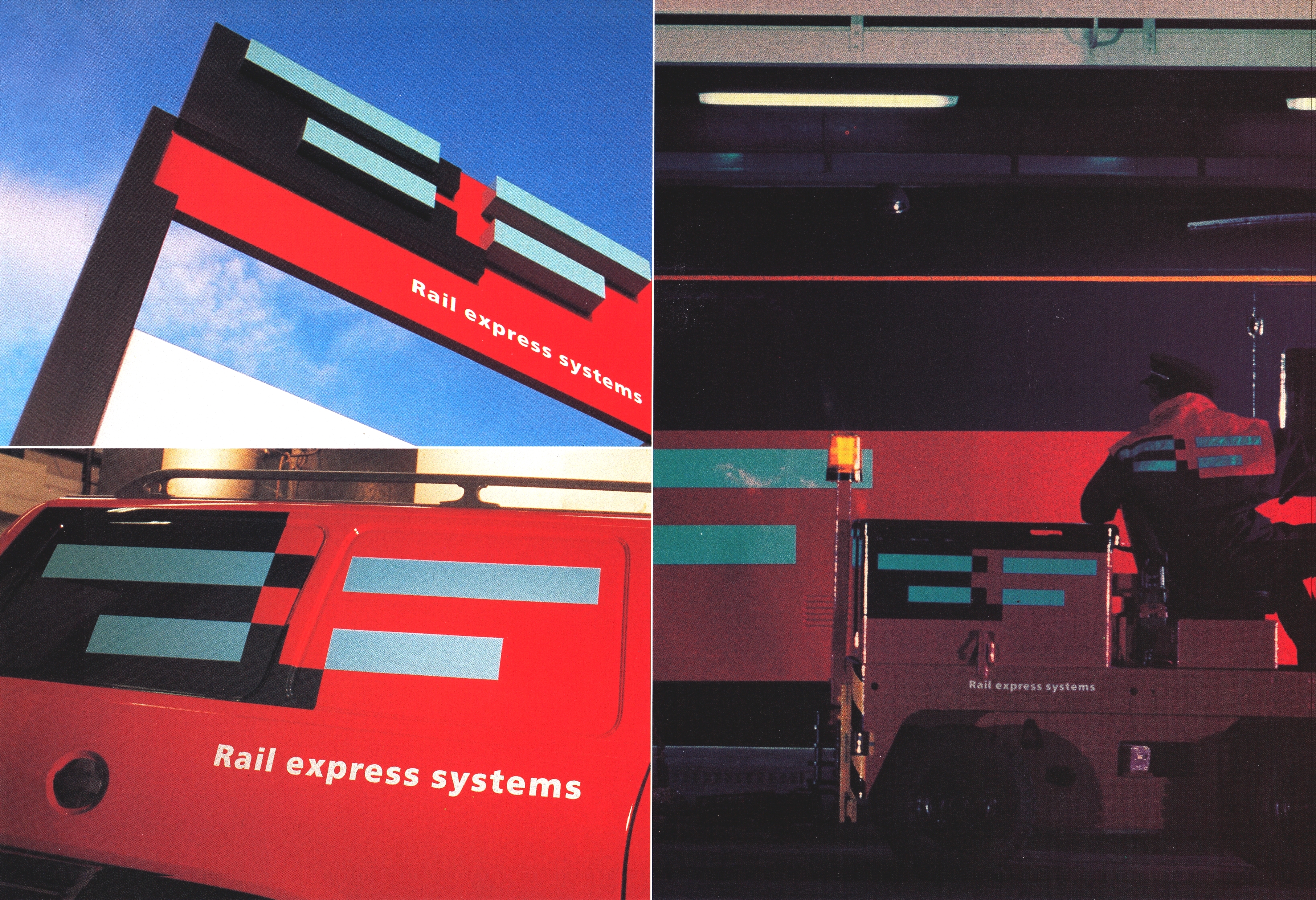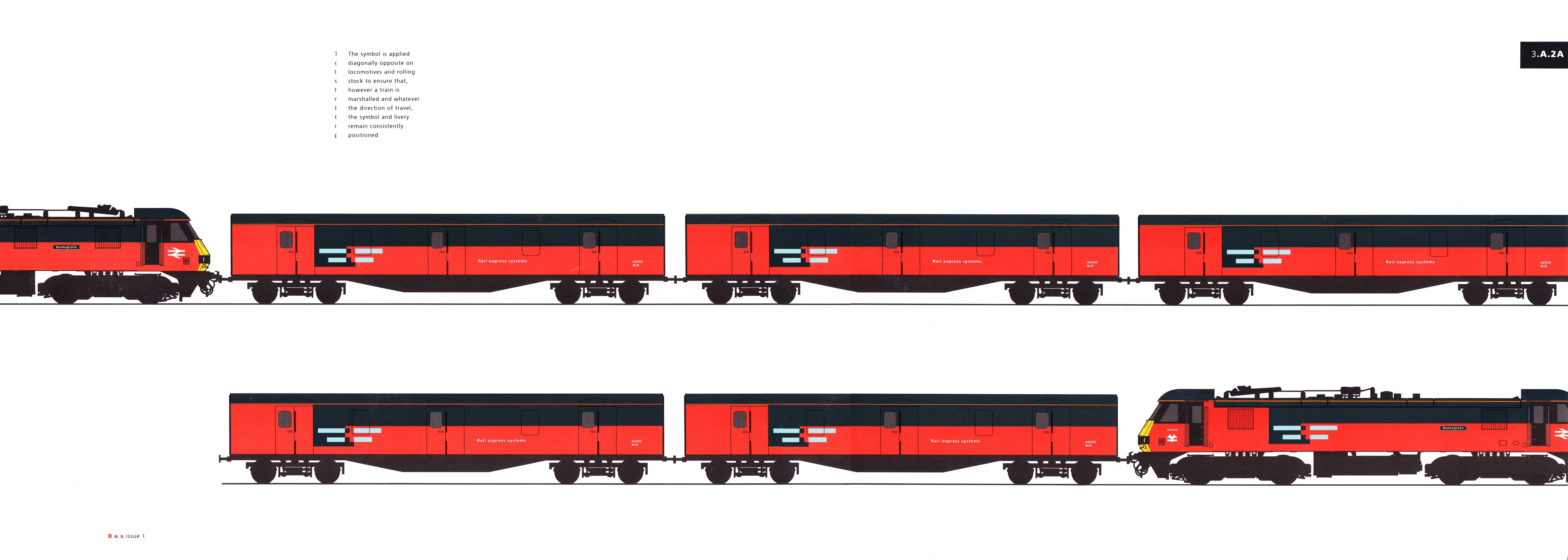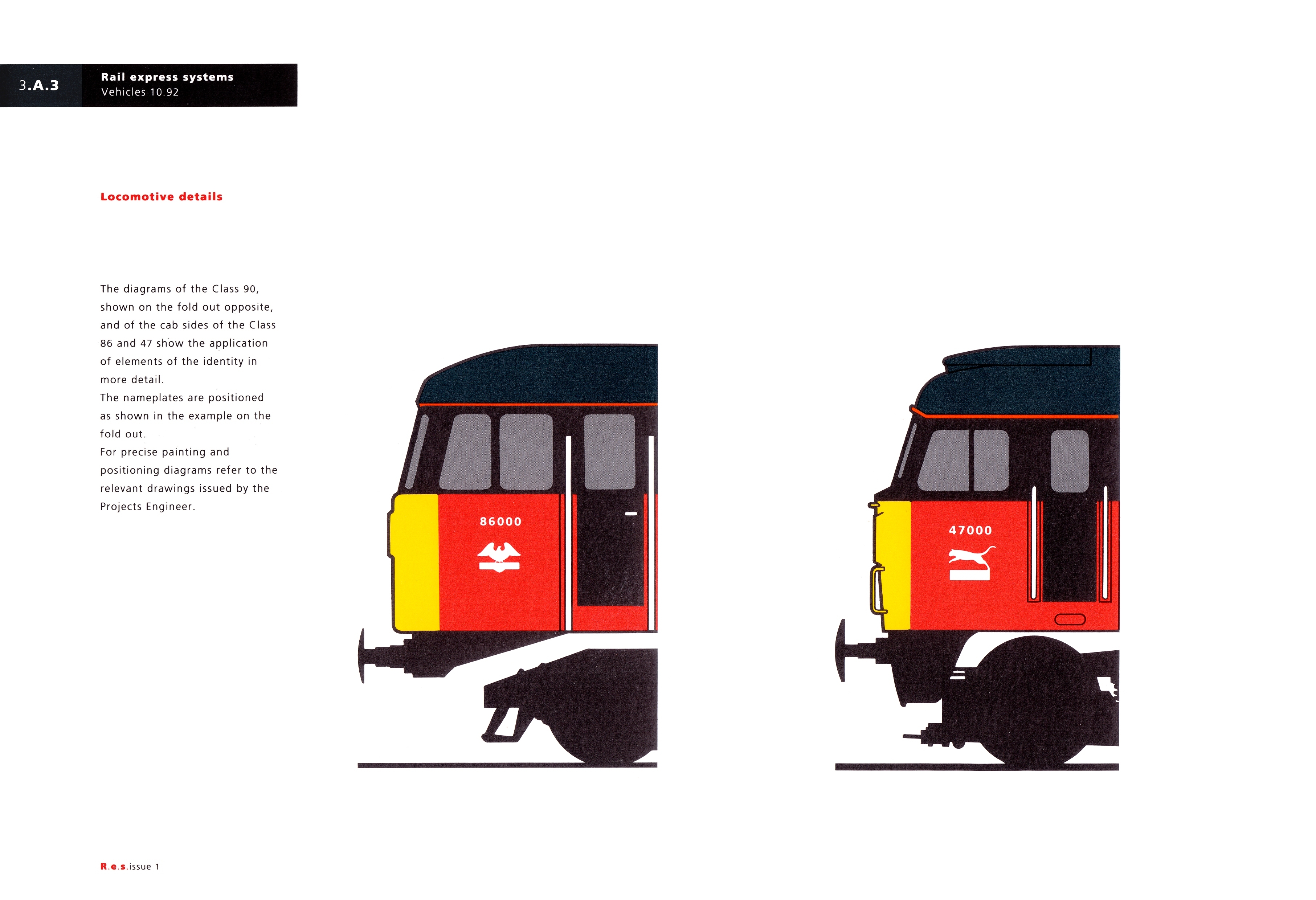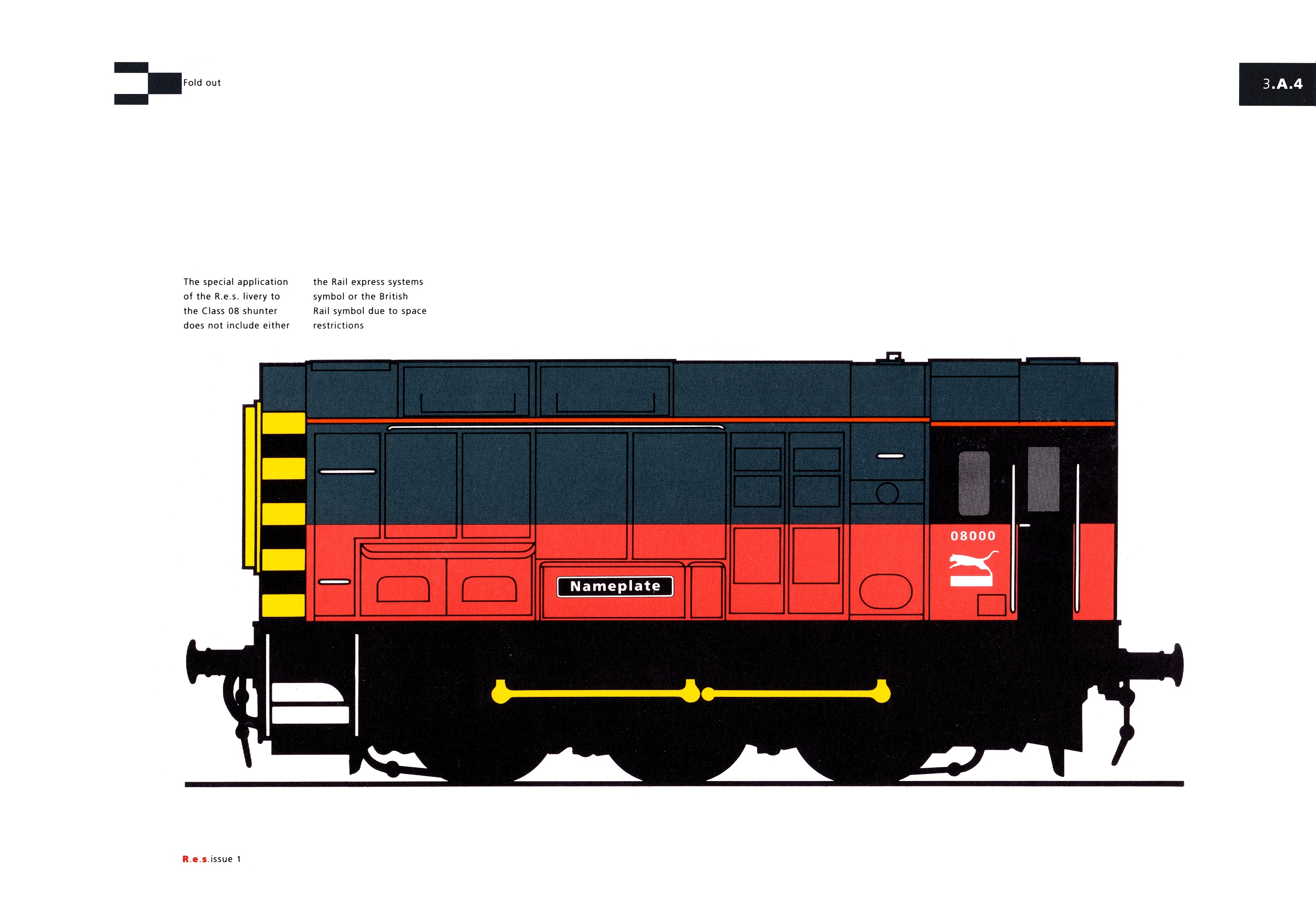 The British Rail Parcels sector—responsible for the distribution by rail of parcels and mail—was rebranded Rail express systems (R.e.s.) in 1991. The design work was once again awarded to Roundel Design following the successful rebranding of Railfreight in 1987. In October 1992 R.e.s. released a Design Manual in landscape 4-ring binder format with 307×210mm pages on 250gsm stock, many of which were double-sided and some folded out.