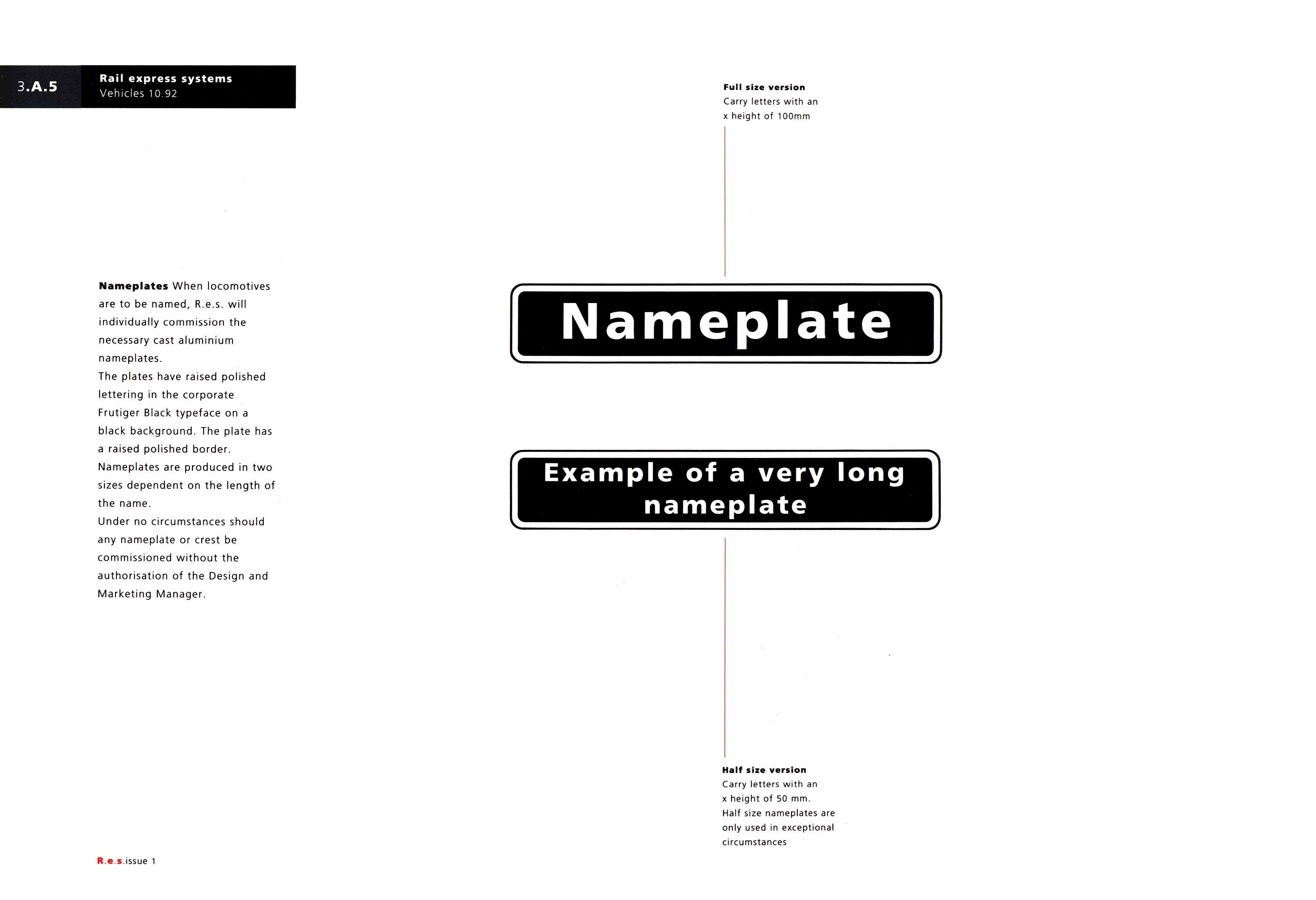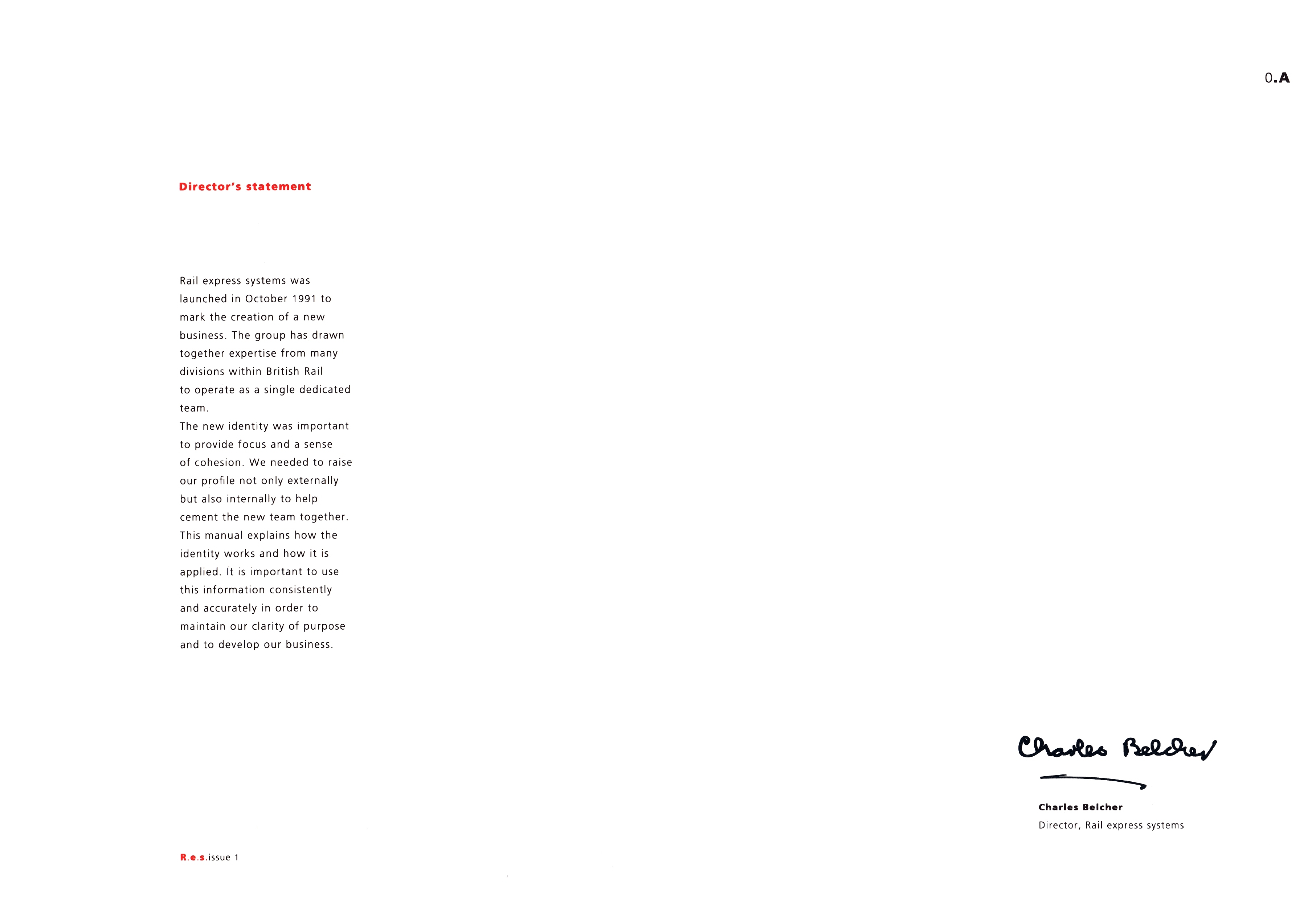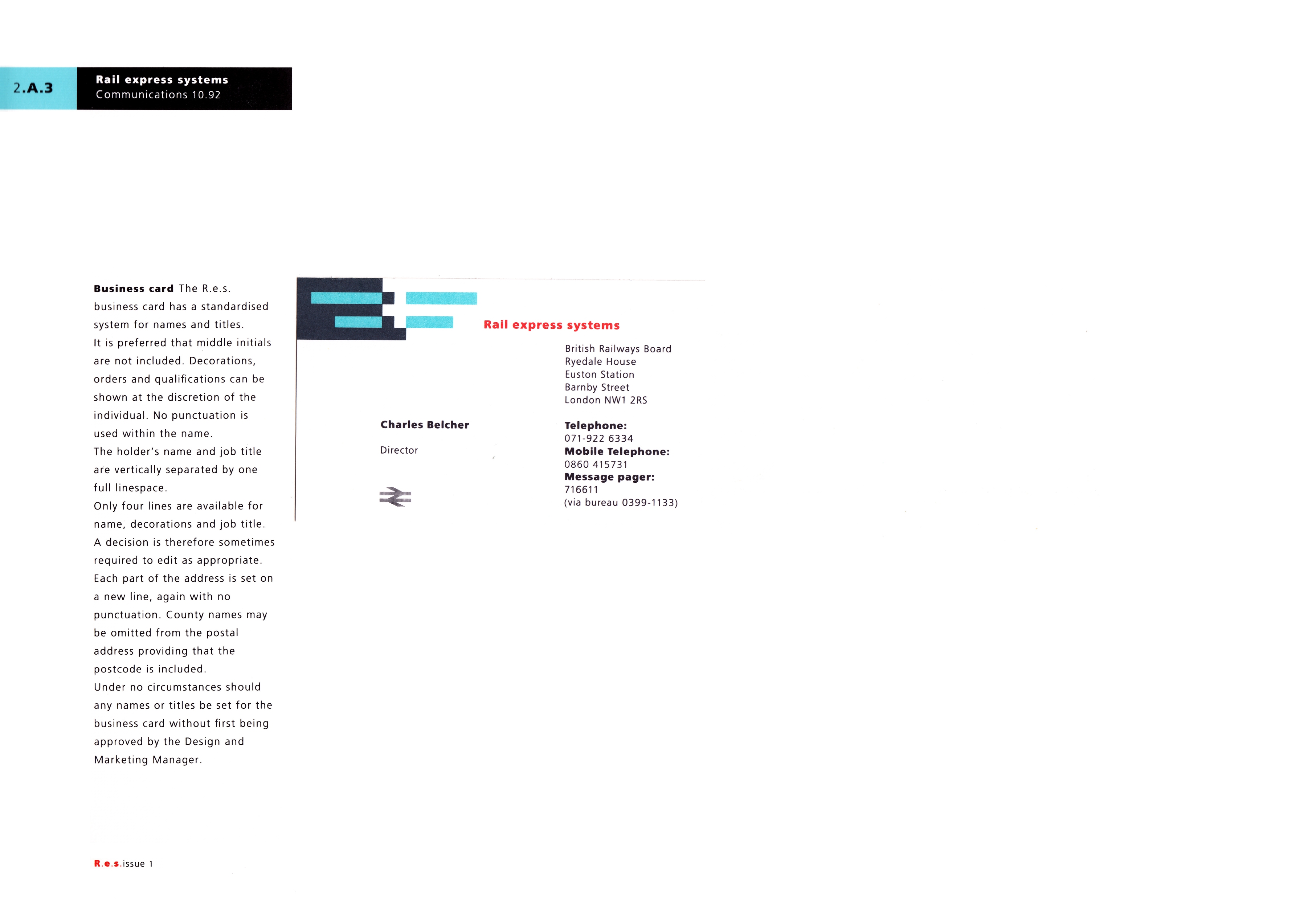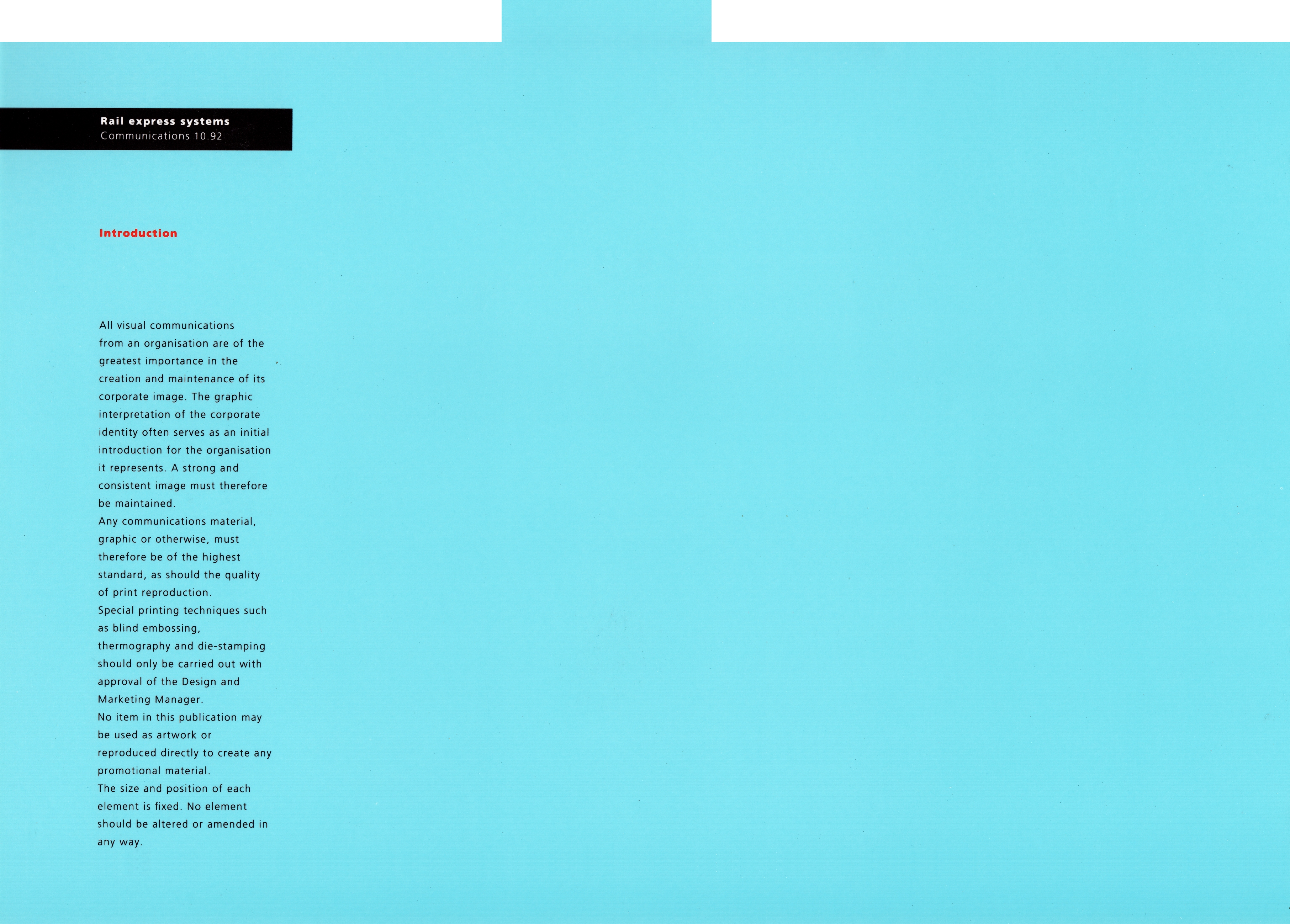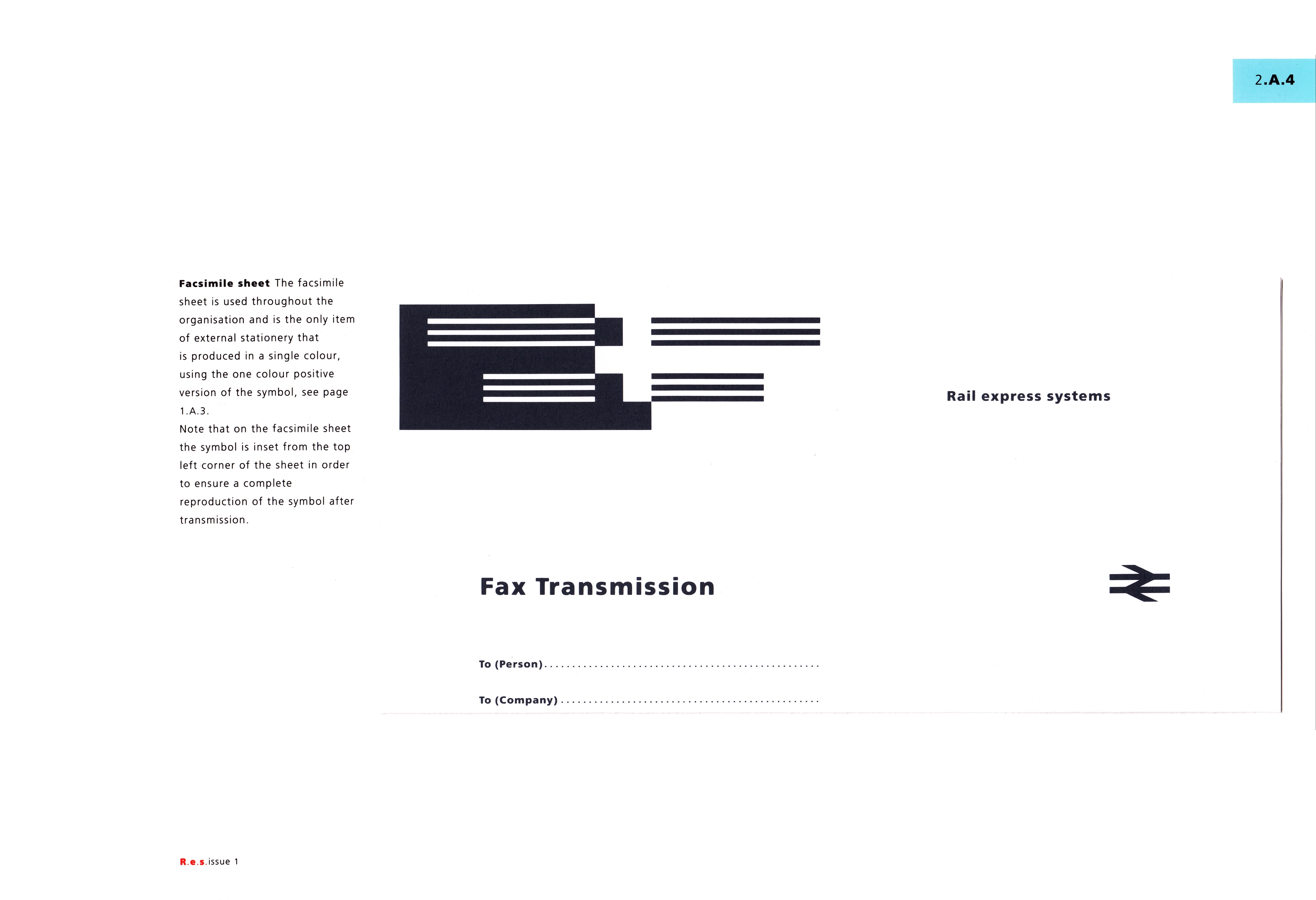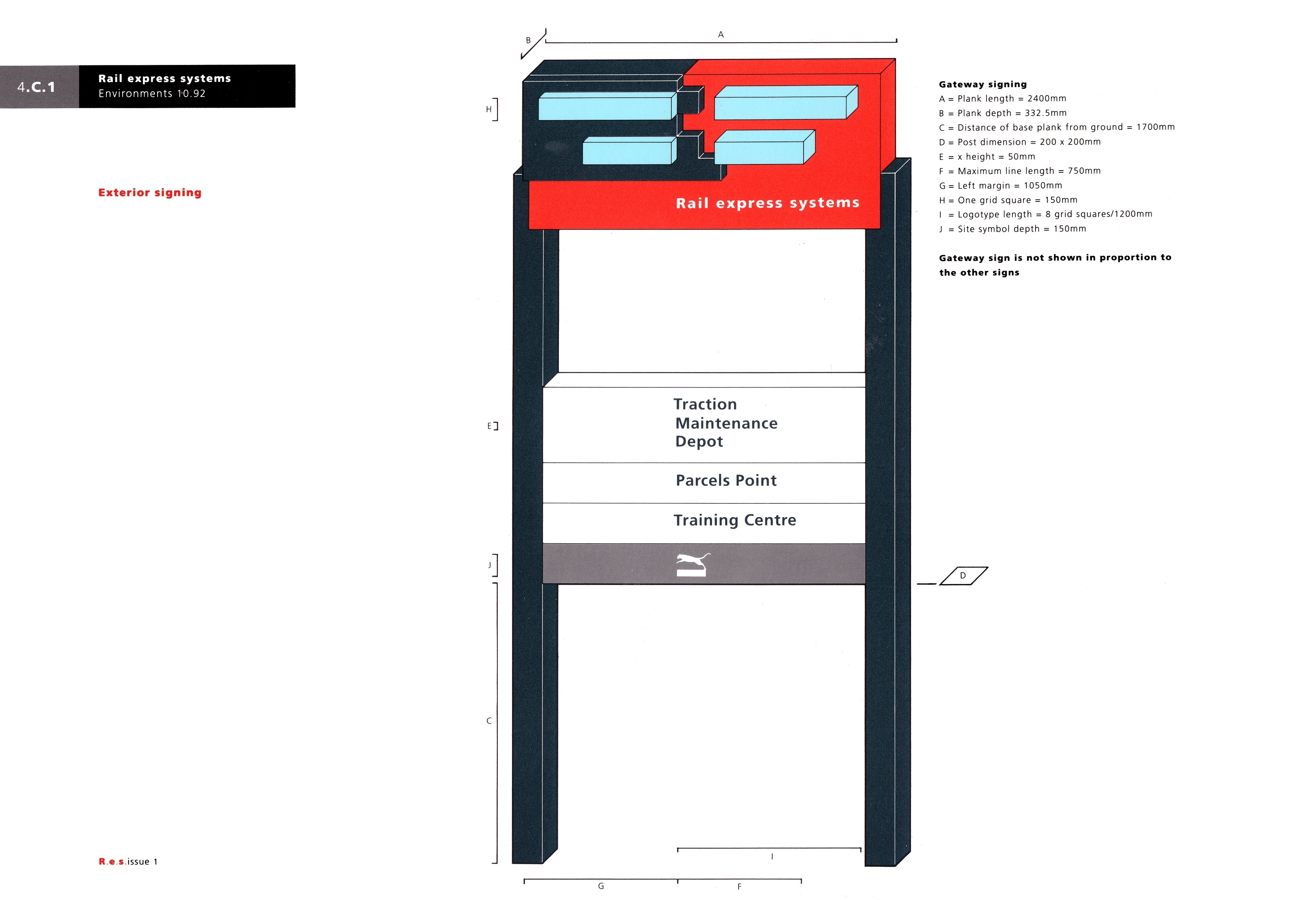The British Rail Parcels sector—responsible for the distribution by rail of parcels and mail—was rebranded Rail express systems (R.e.s.) in 1991. The design work was once again awarded to Roundel Design following the successful rebranding of Railfreight in 1987. In October 1992 R.e.s. released a Design Manual in landscape 4-ring binder format with 307×210mm pages on 250gsm stock, many of which were double-sided and some folded out.