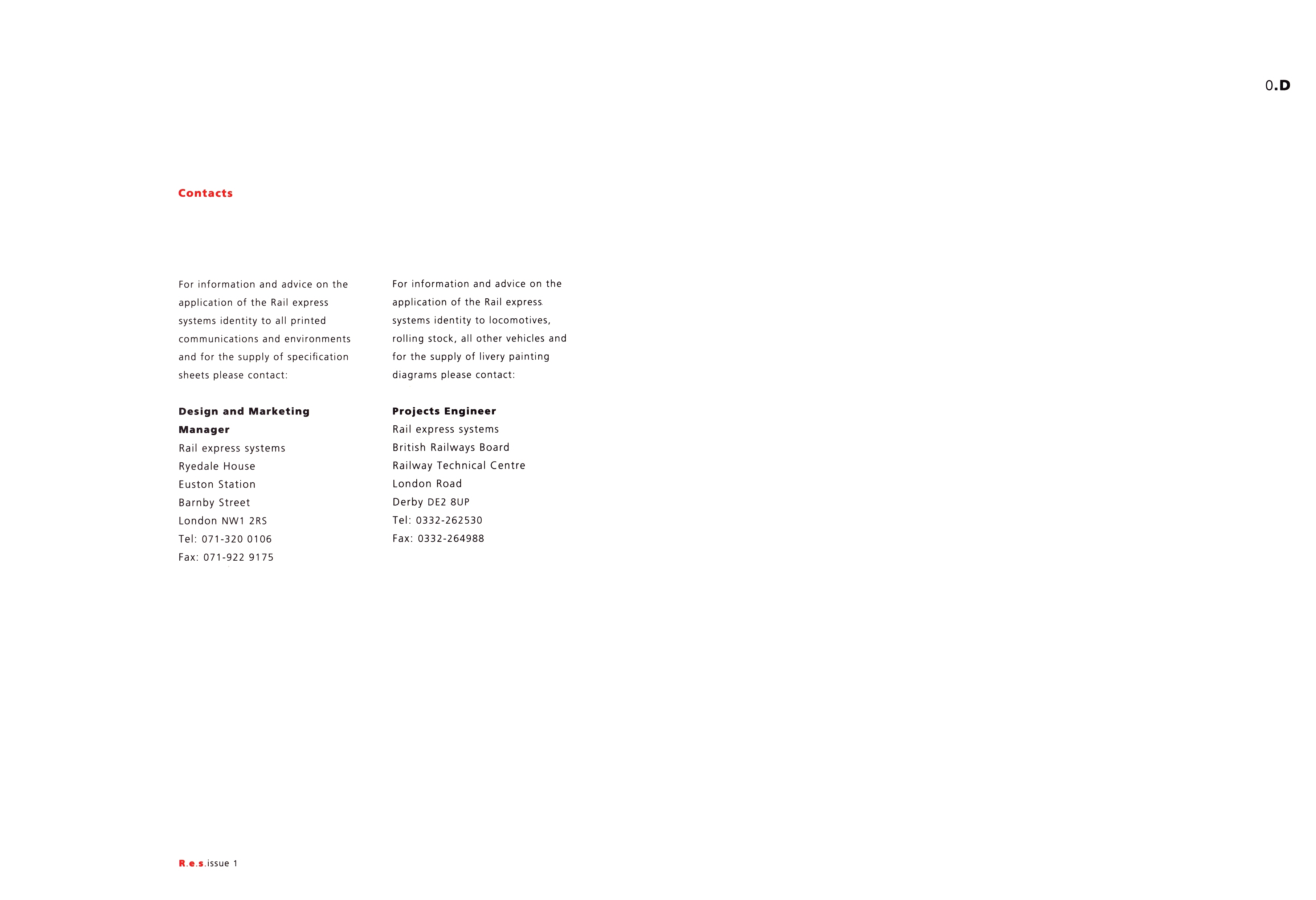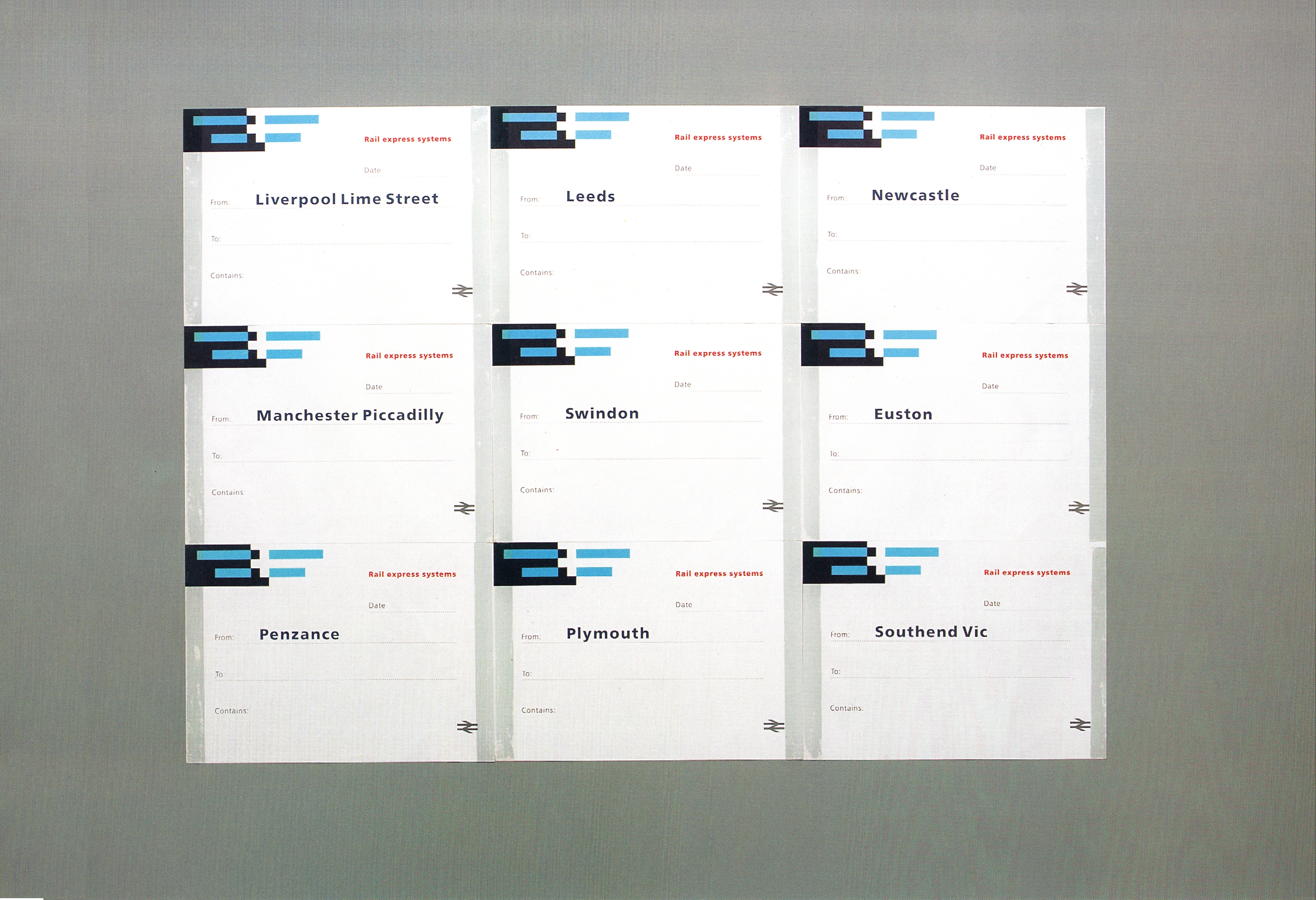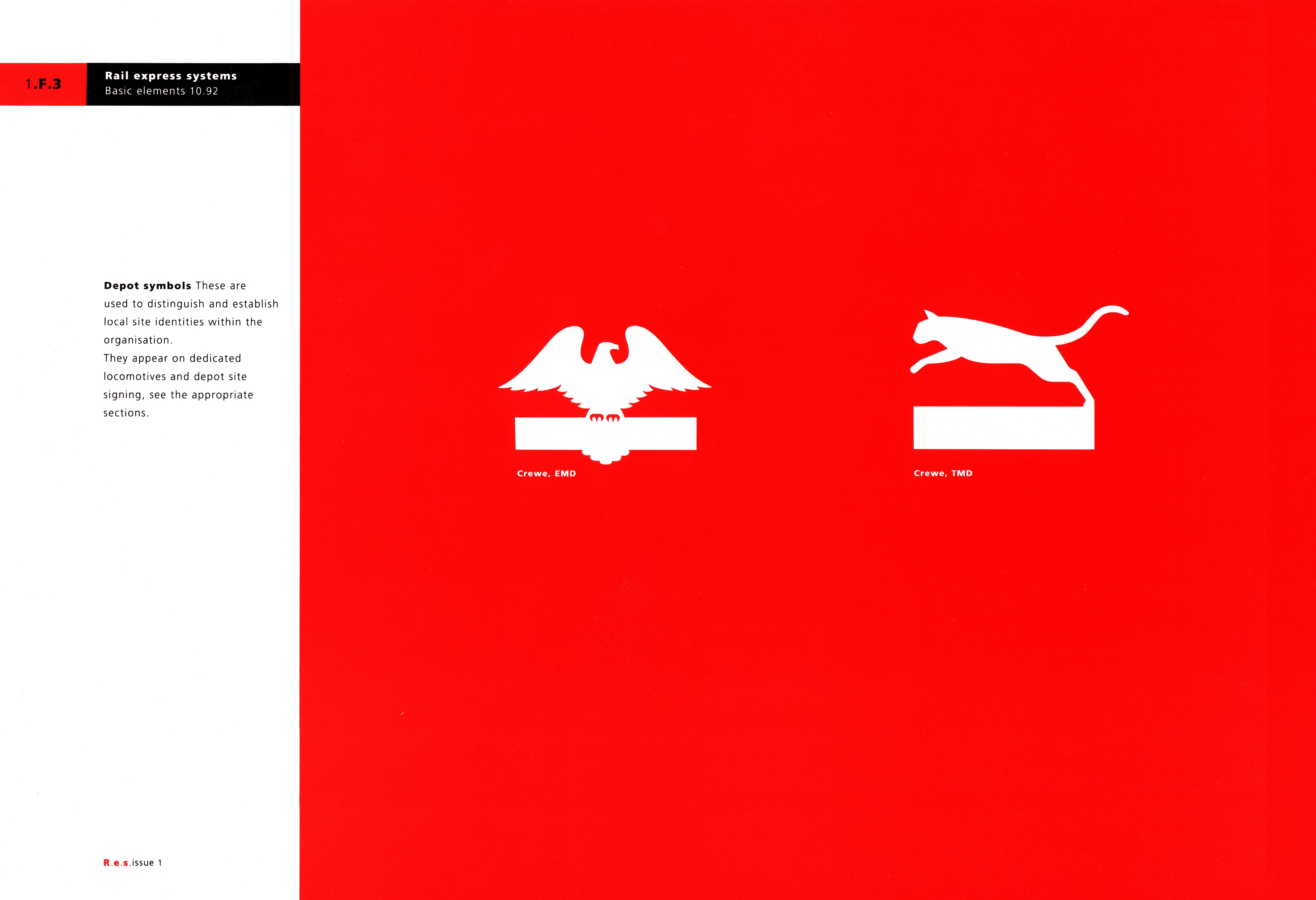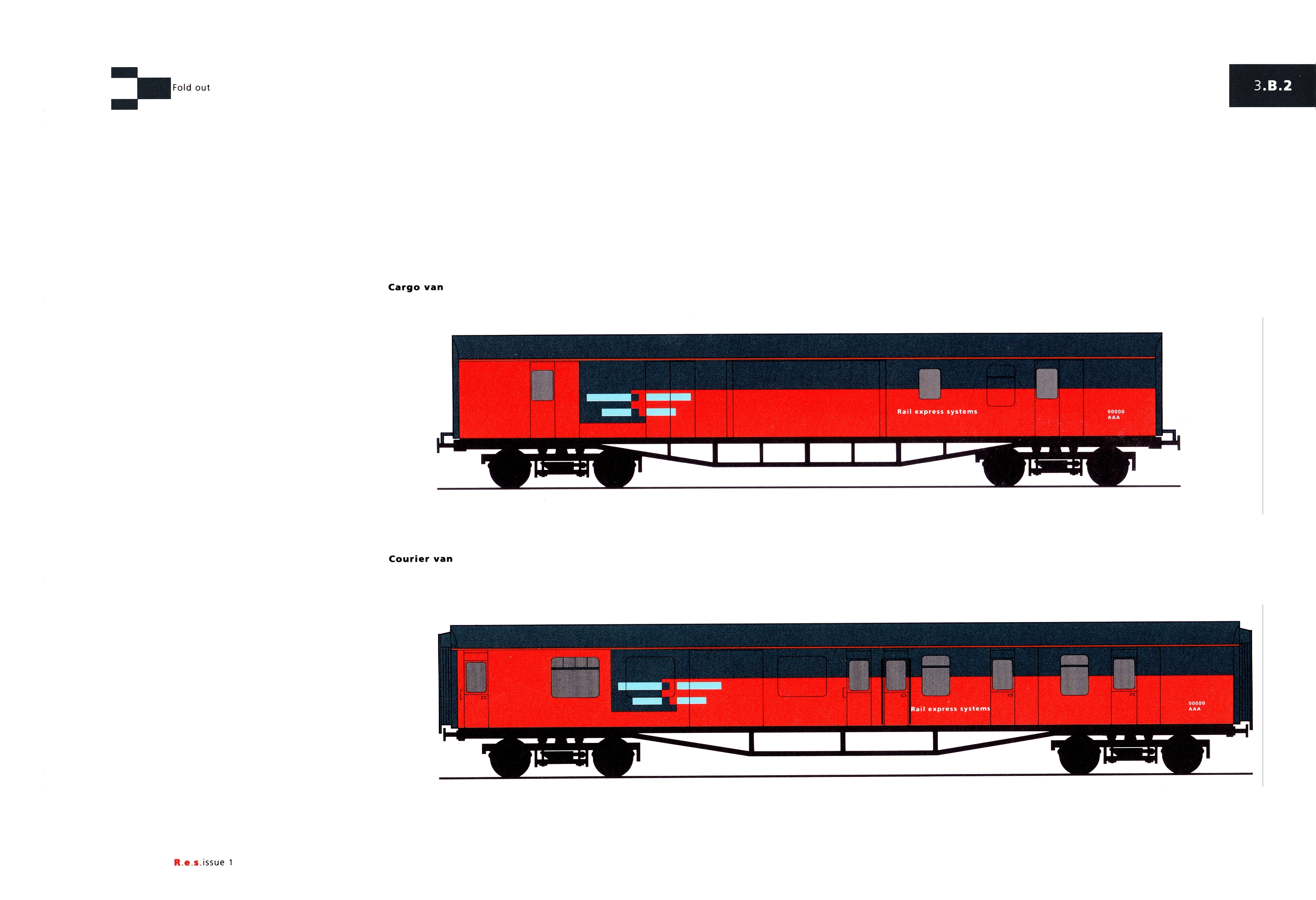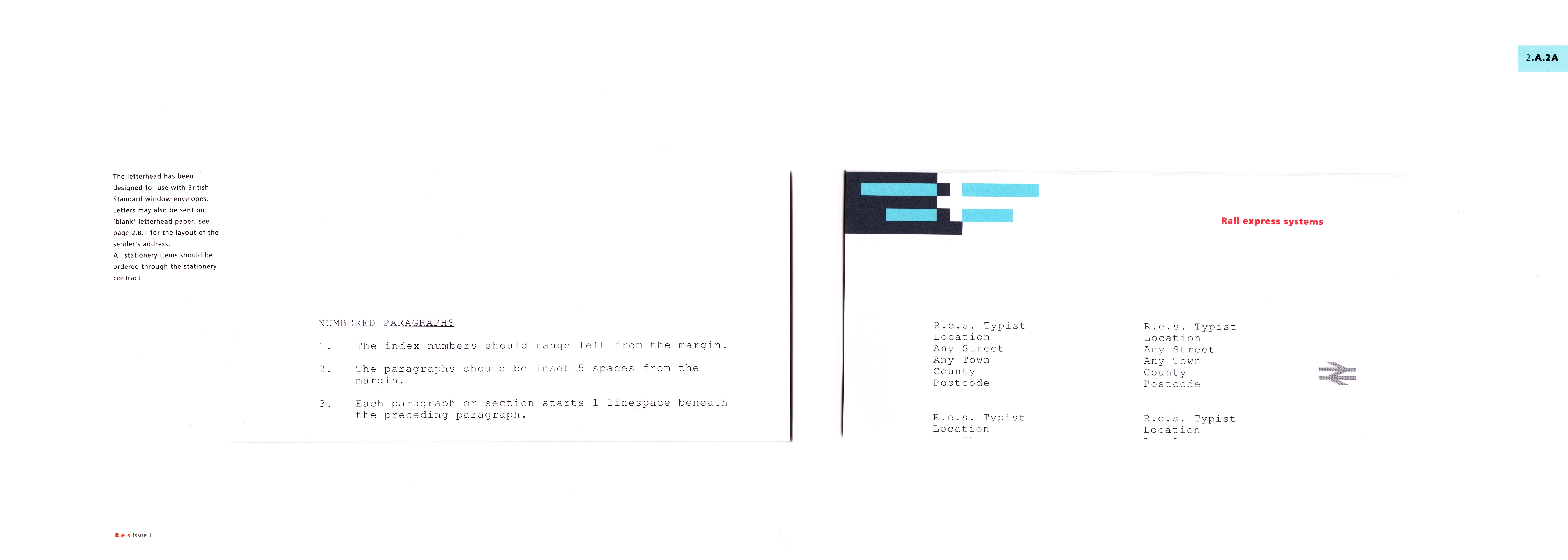The British Rail Parcels sector—responsible for the distribution by rail of parcels and mail—was rebranded Rail express systems (R.e.s.) in 1991. The design work was once again awarded to Roundel Design following the successful rebranding of Railfreight in 1987. In October 1992 R.e.s. released a Design Manual in landscape 4-ring binder format with 307×210mm pages on 250gsm stock, many of which were double-sided and some folded out.