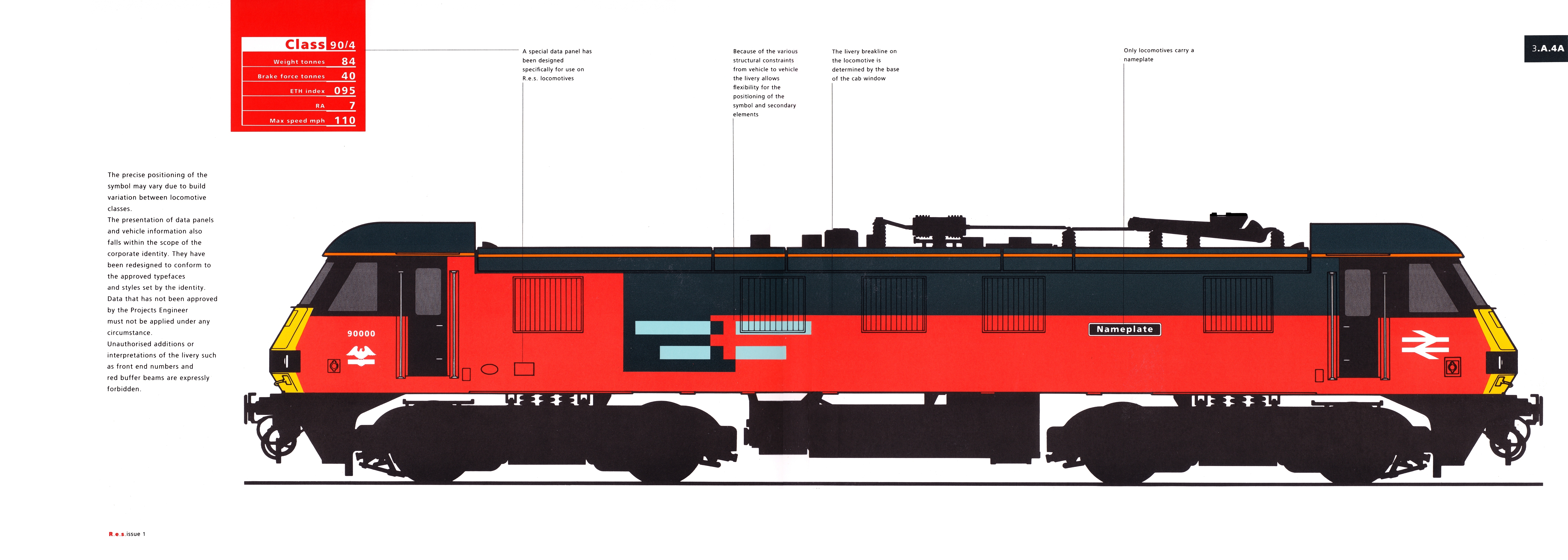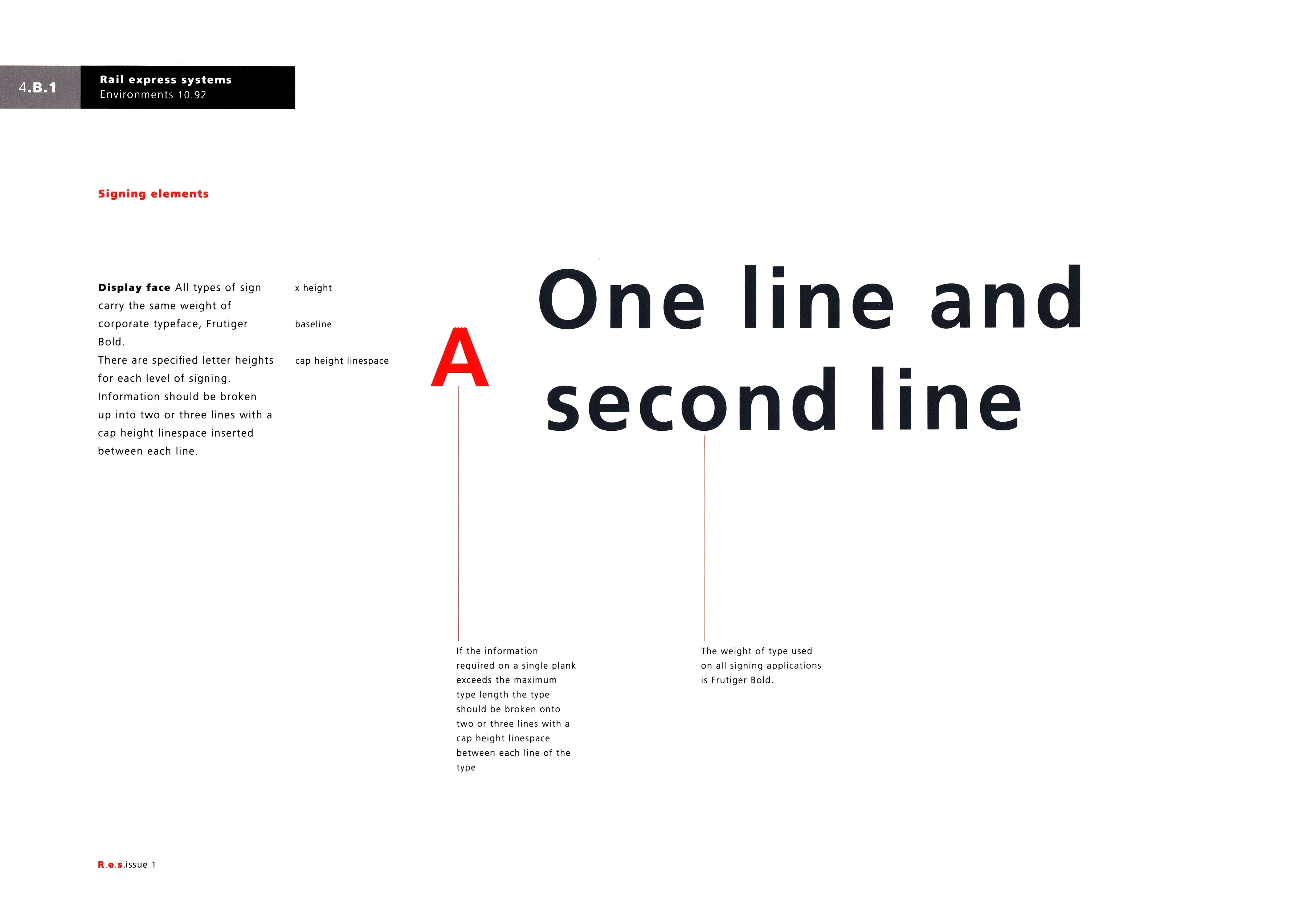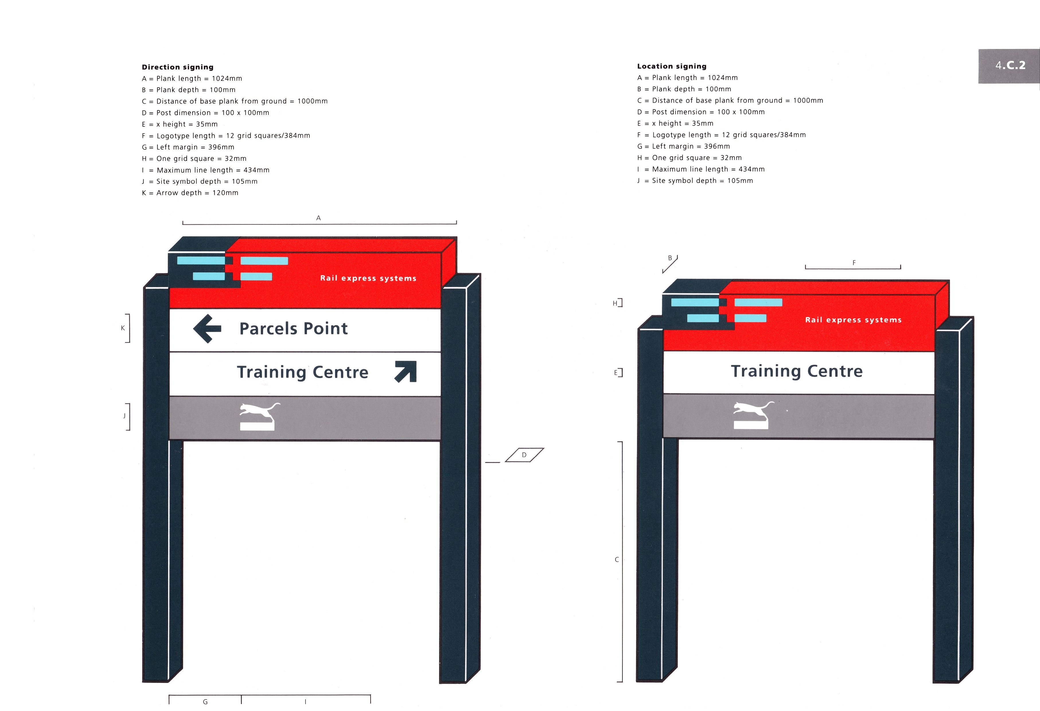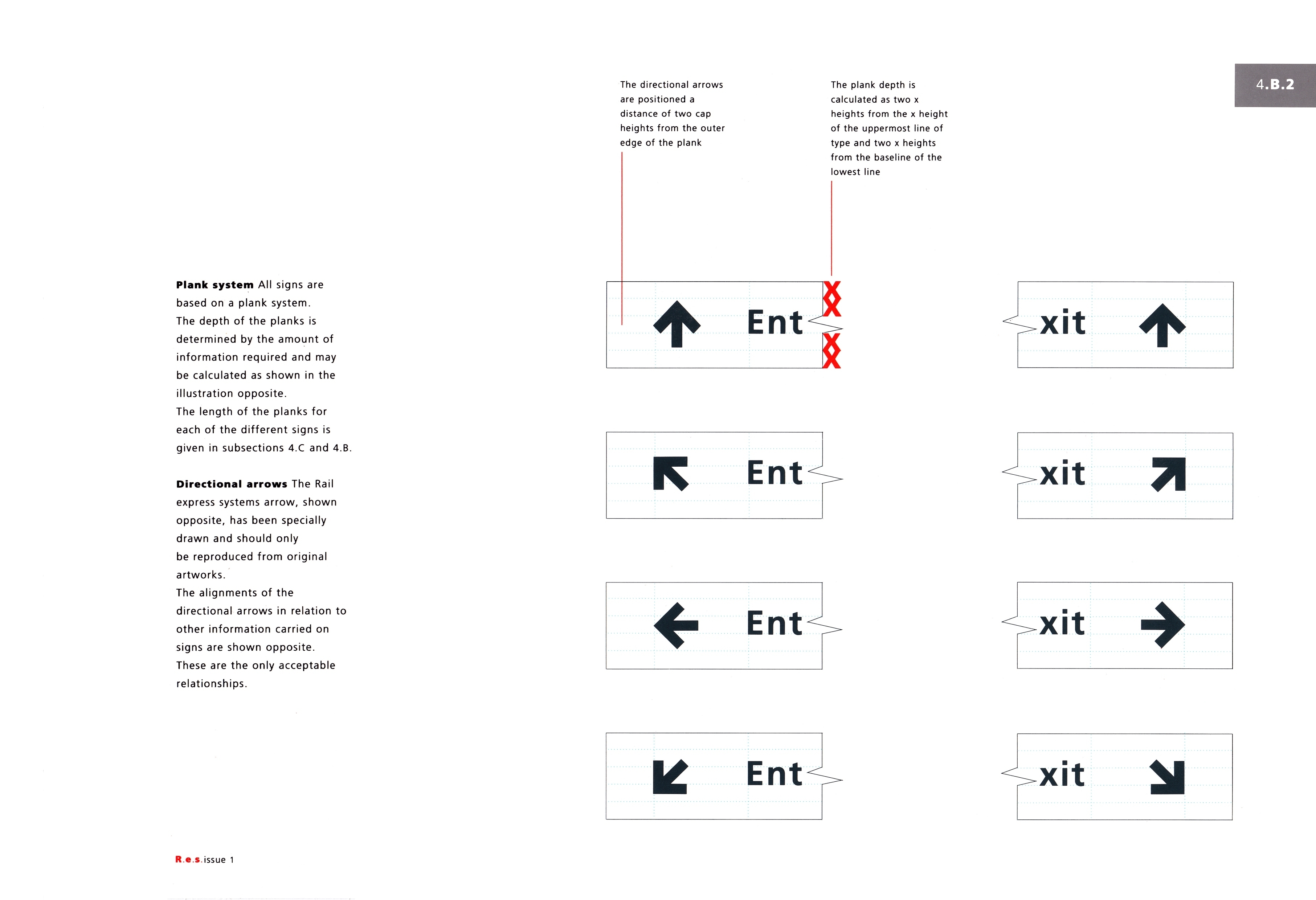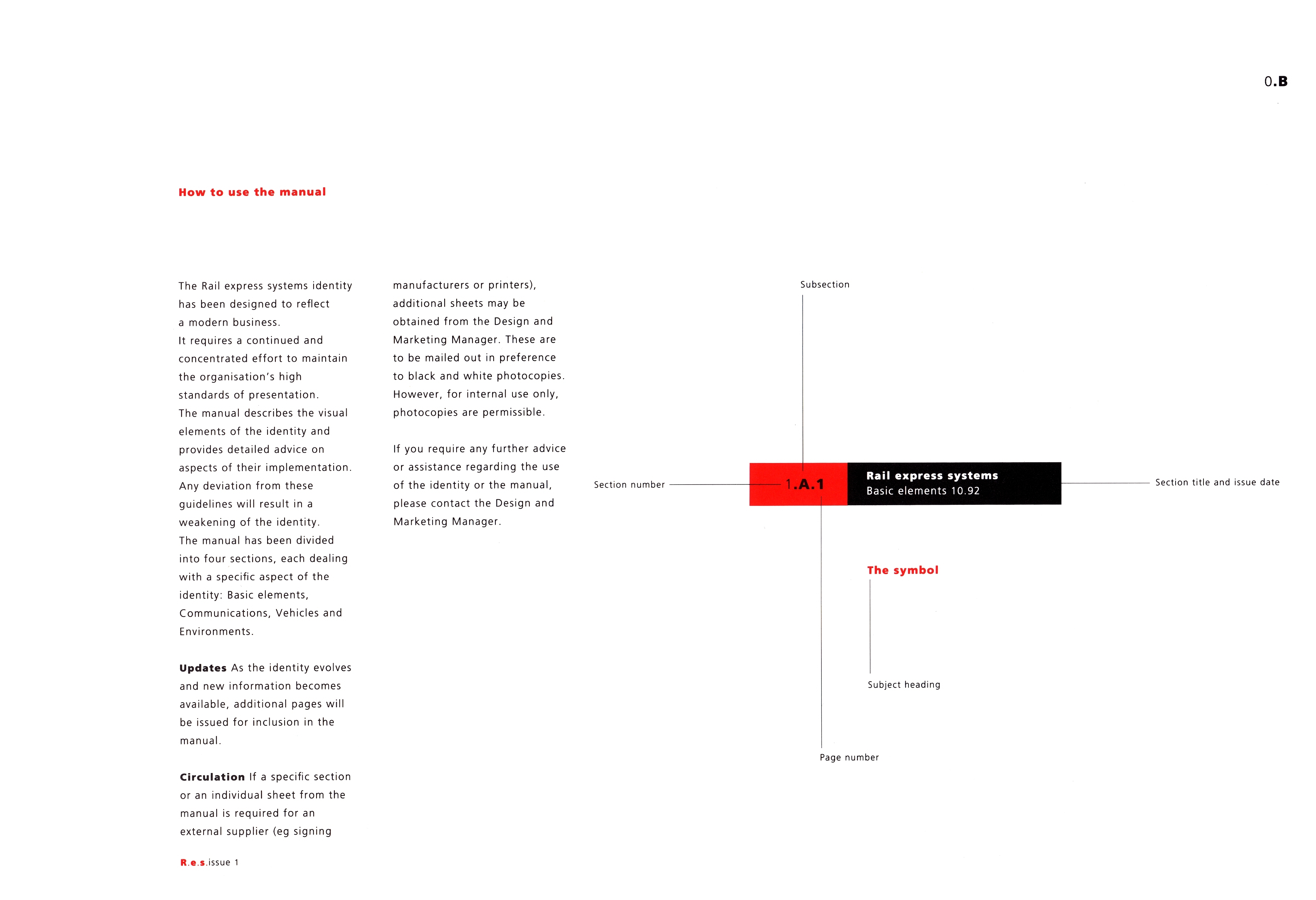 The British Rail Parcels sector—responsible for the distribution by rail of parcels and mail—was rebranded Rail express systems (R.e.s.) in 1991. The design work was once again awarded to Roundel Design following the successful rebranding of Railfreight in 1987. In October 1992 R.e.s. released a Design Manual in landscape 4-ring binder format with 307×210mm pages on 250gsm stock, many of which were double-sided and some folded out.